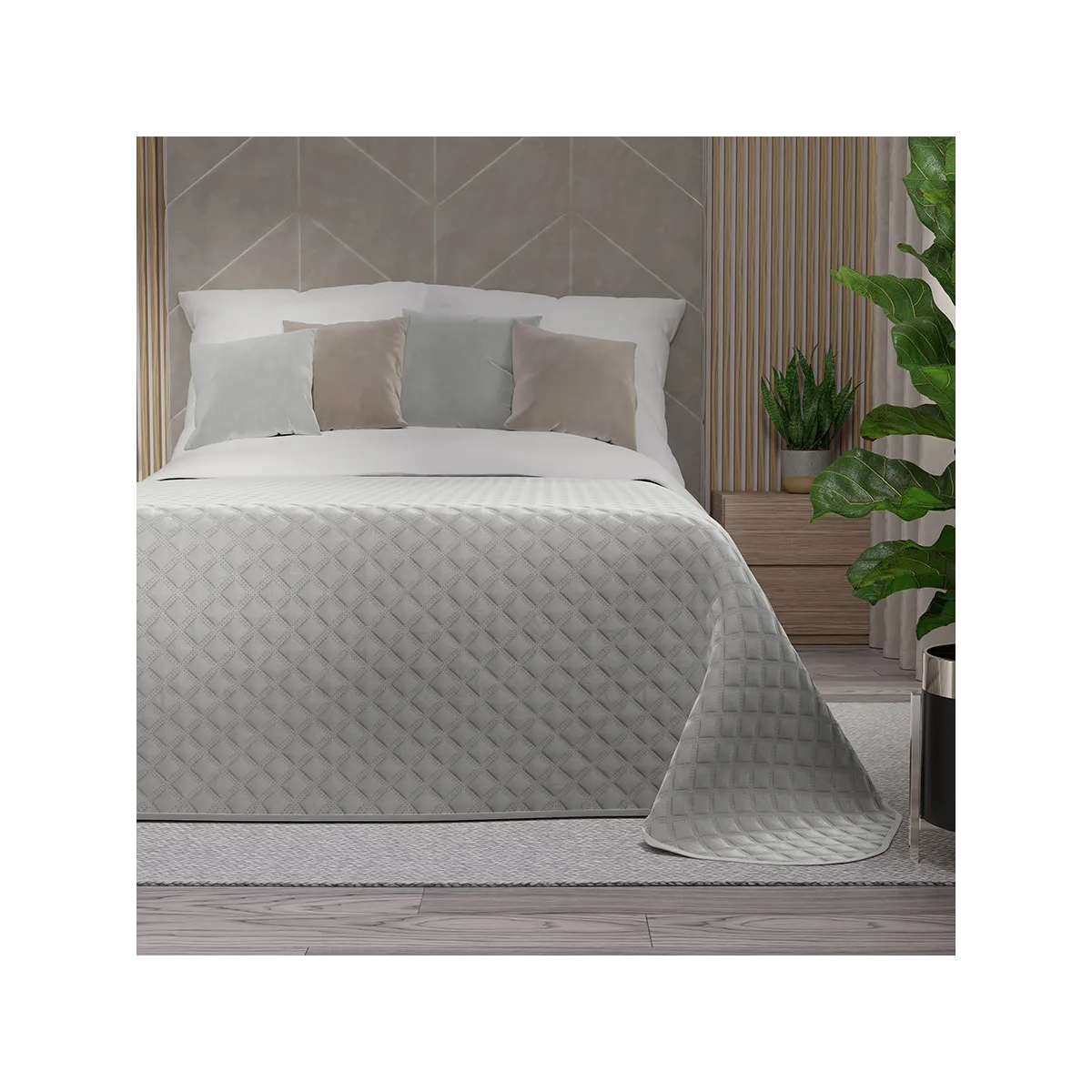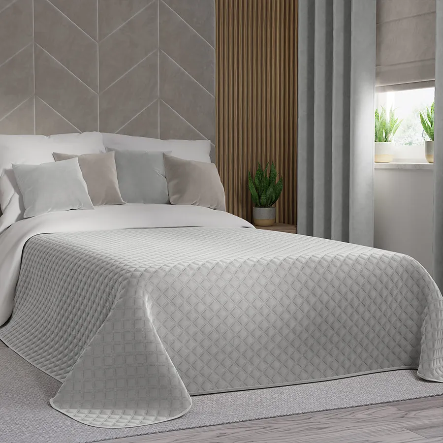 Pastelowa, szara narzuta dekoracyjna VELVI to esencja subtelnej elegancji. Jej delikatny kolor i pikowana faktura nadają sypialni spokojny, wyrafinowany charakter. Rozmiar 220x240 cm zapewnia idealne dopasowanie do większych łóżek, gwarantując komfort i estetyczny wygląd wnętrza.