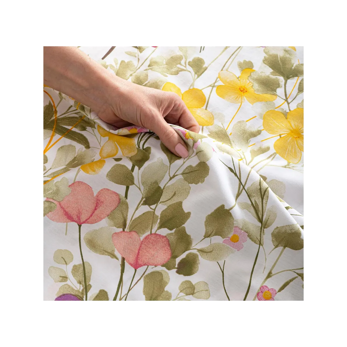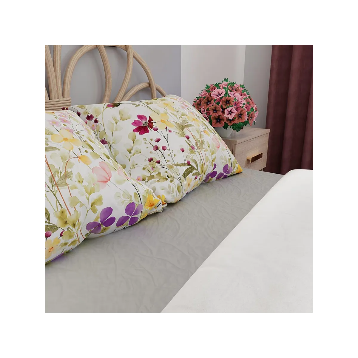 Delikatna, romantyczna i pełna świeżości – taka właśnie jest pościel FLORINA! 🌿 Na śnieżnobiałym tle rozkwita lekki, pastelowy wzór przypominający letnią łąkę – znajdziesz tu subtelne odcienie różu, żółci, zieleni i fioletu, które tworzą harmonijną kompozycję rodem z obrazów akwarelowych.