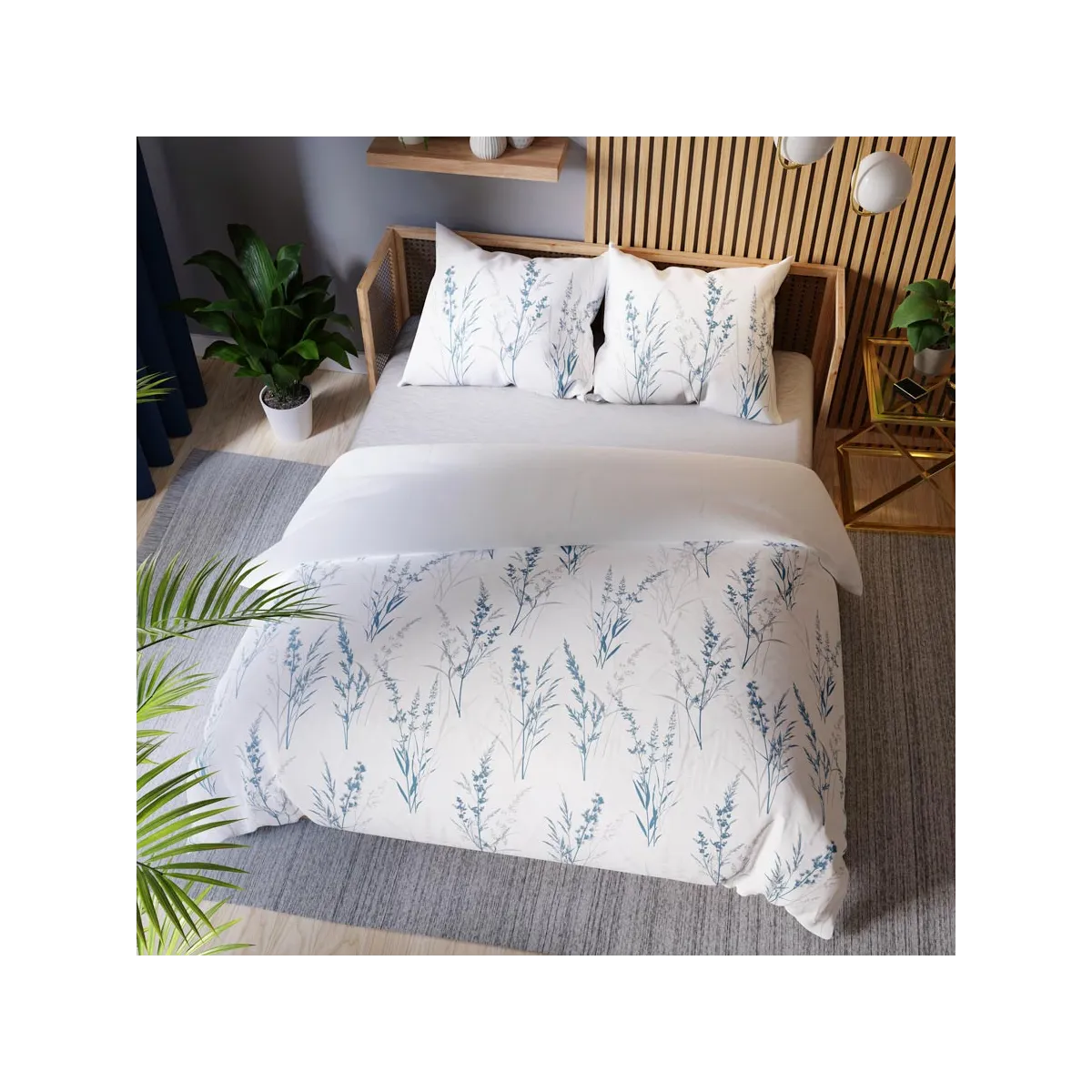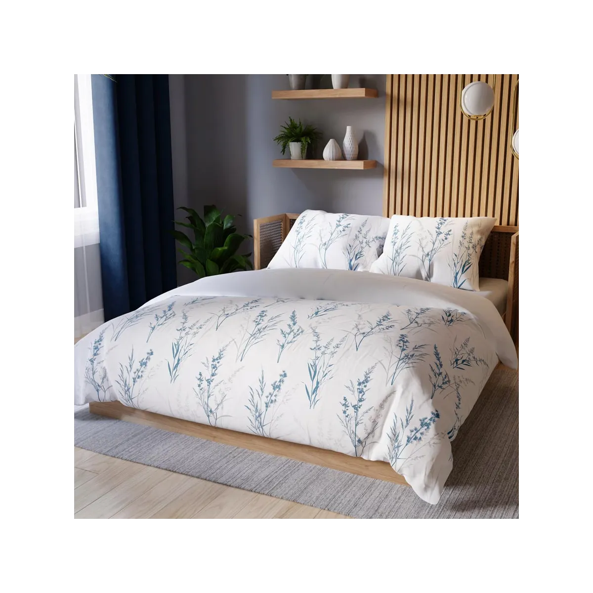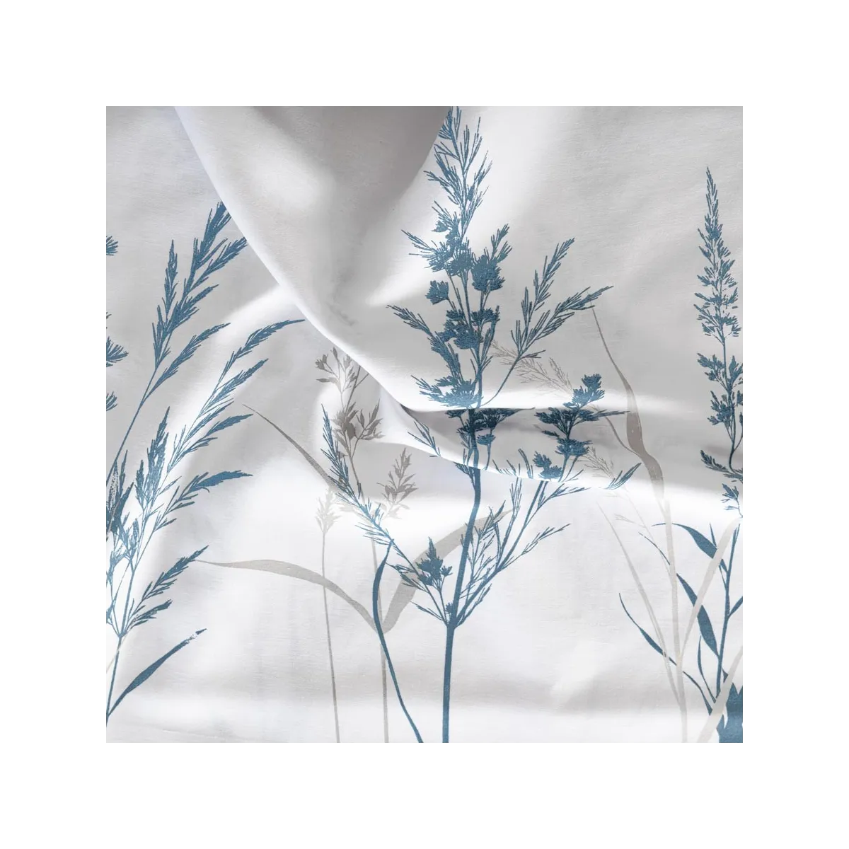 Pościel SELA to idealna propozycja dla tych, którzy cenią minimalizm i bliskość natury. Na śnieżnobiałym tle rozciąga się subtelny, roślinny wzór przypominający polne trawy, namalowane delikatnymi pociągnięciami w odcieniach błękitu i szarości. Wzór ten wprowadza do wnętrza harmonię i świeżość, nadając sypialni lekki, odprężający charakter.