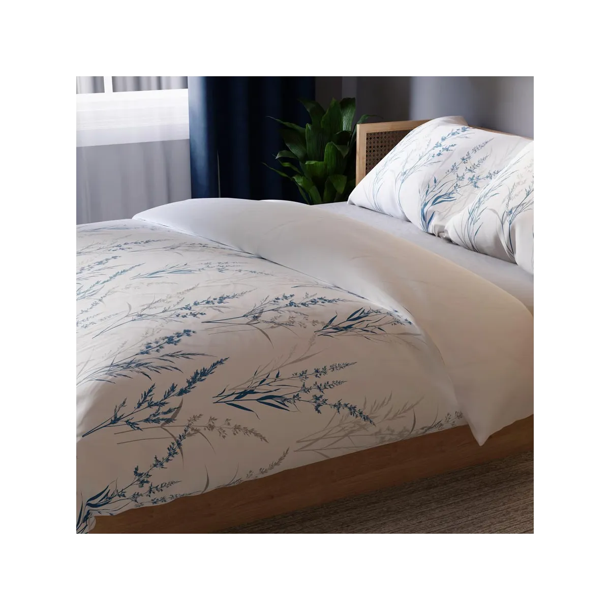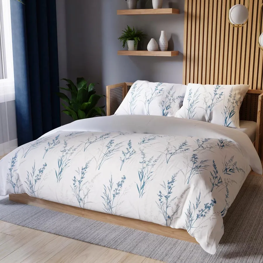 SELA to pościel, która zachwyca subtelnym wzornictwem inspirowanym naturą. Na czystym, białym tle rozciągają się lekkie trawy i źdźbła w odcieniach niebieskiego i szarości – jak akwarela namalowana na płótnie. Wzór ten wprowadza do wnętrza atmosferę ciszy, spokoju i lekkości. Idealny wybór dla tych, którzy szukają harmonii w codziennym otoczeniu.