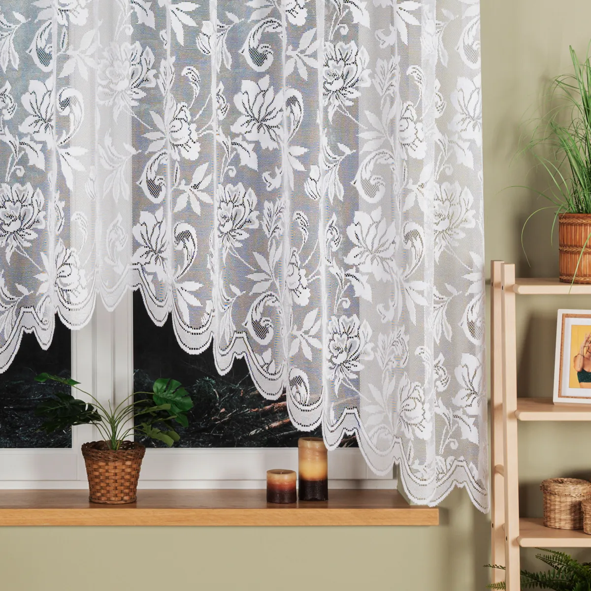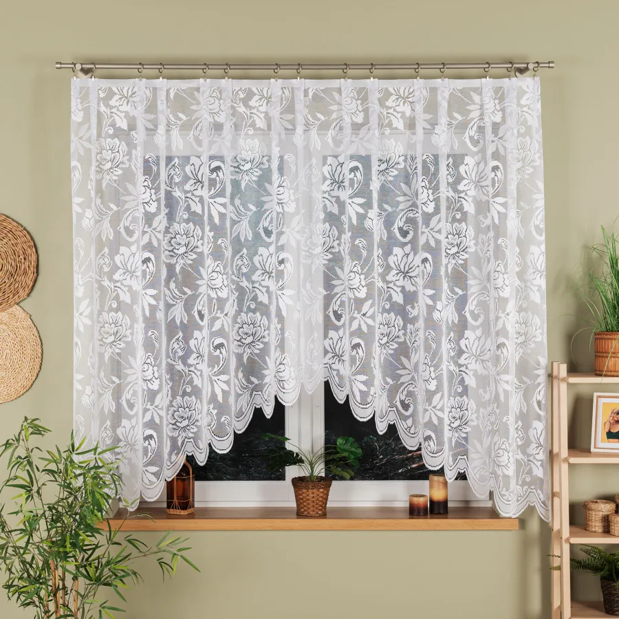 Rozmiar 300x180 cm sprawdzi się jako dekoracja okna w salonie, sypialni czy jadalni, a biały kolor i kwiaty pięknie rozjaśniają przestrzeń. To także dobry wybór do kuchni lub pokoju gościnnego, gdy zależy Ci na klasycznej oprawie okna i lekkim efekcie.