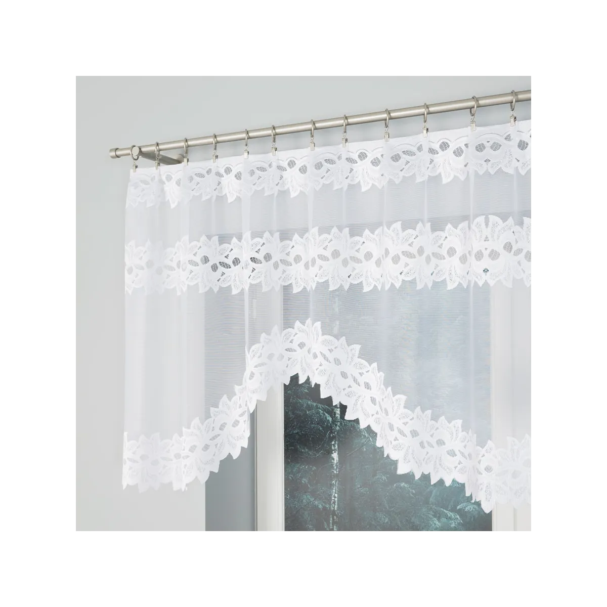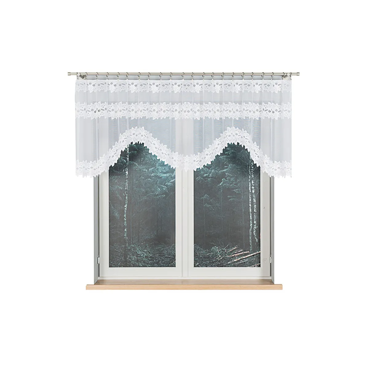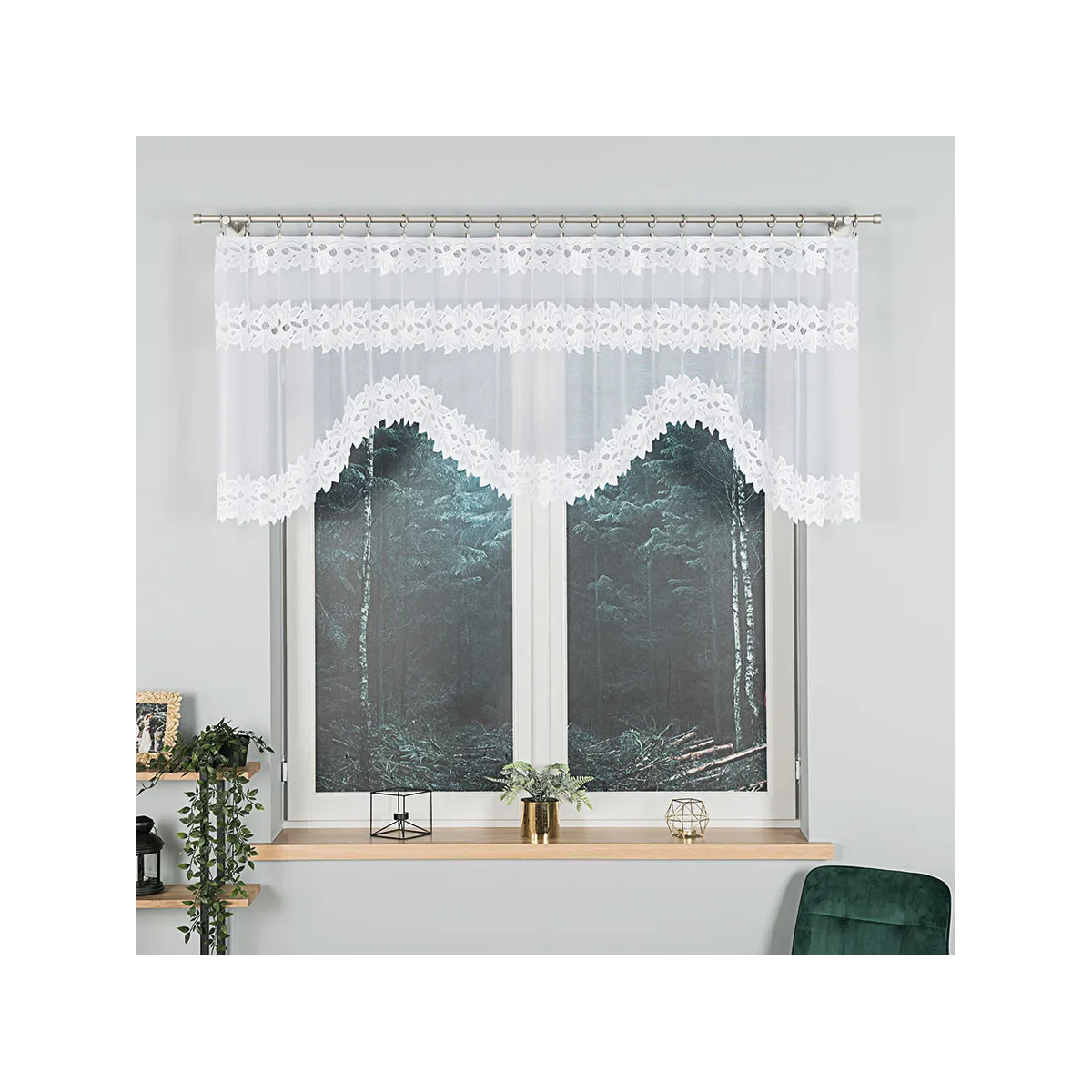- Podcięcie u dołu Falowana linia wykończenia tworzy efektowną, lekką dekorację okna.