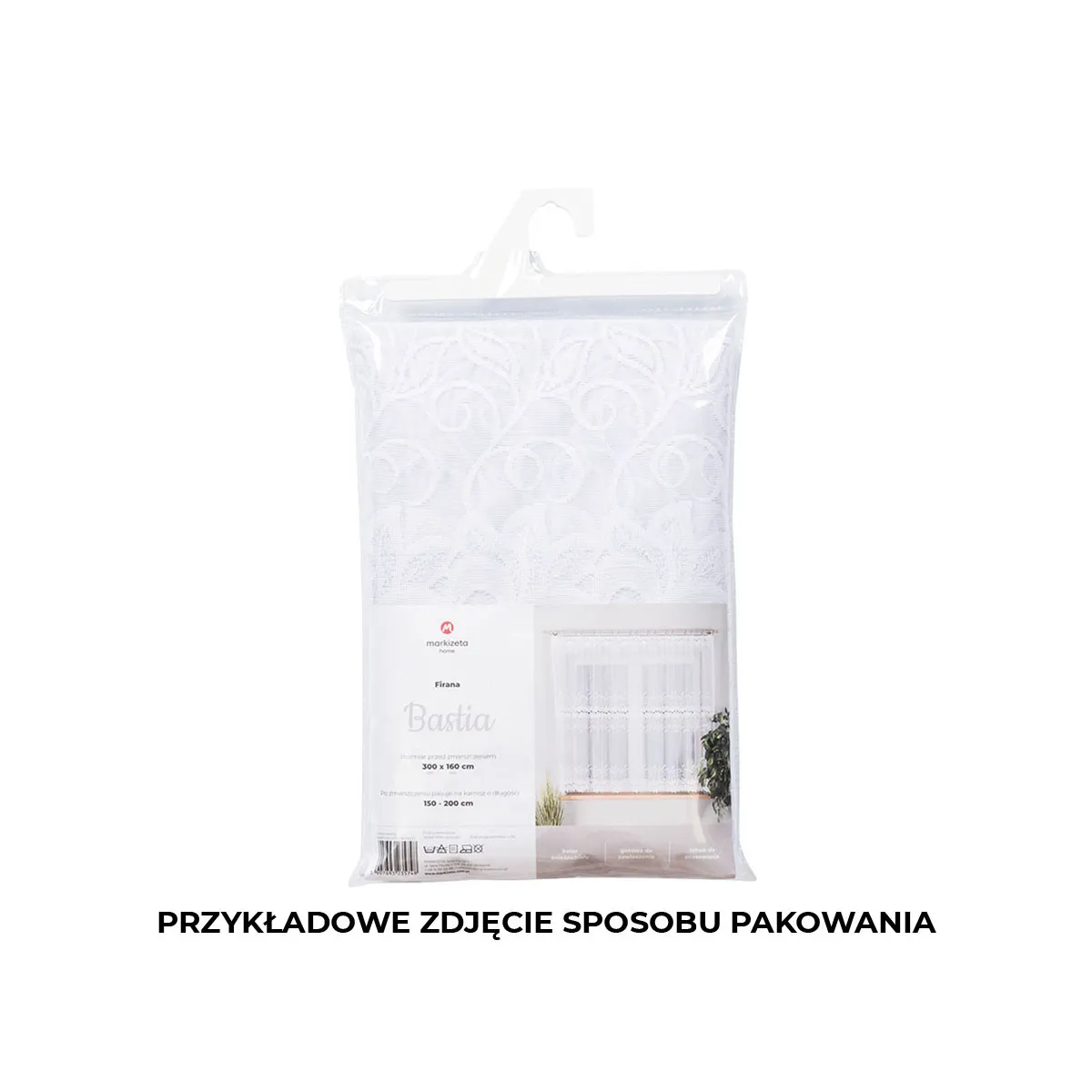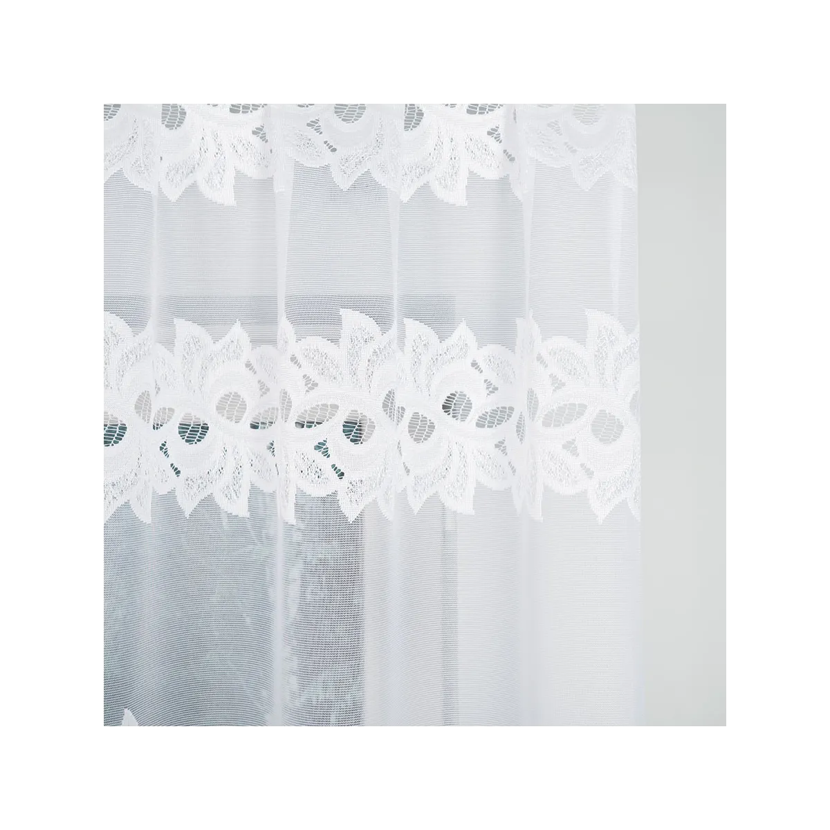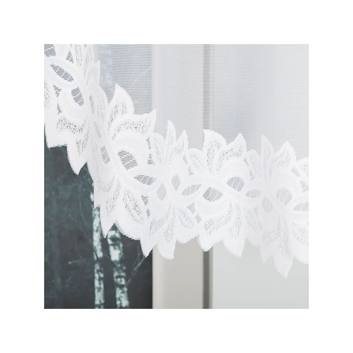 To pojedyncza, biała firanka o wymiarach 230x80 cm, wykonana z dzianiny żakardowej o gramaturze 80–90 g/m². Materiał (100% poliester) jest praktyczny na co dzień, a gotowe wykończenie sprawia, że firanę można od razu zawiesić na żabki. Fabryczne boki nie wymagają obszycia, natomiast dół został wykończony laserowo wytapianą linią, co podkreśla lekkość wzoru i schludny efekt.