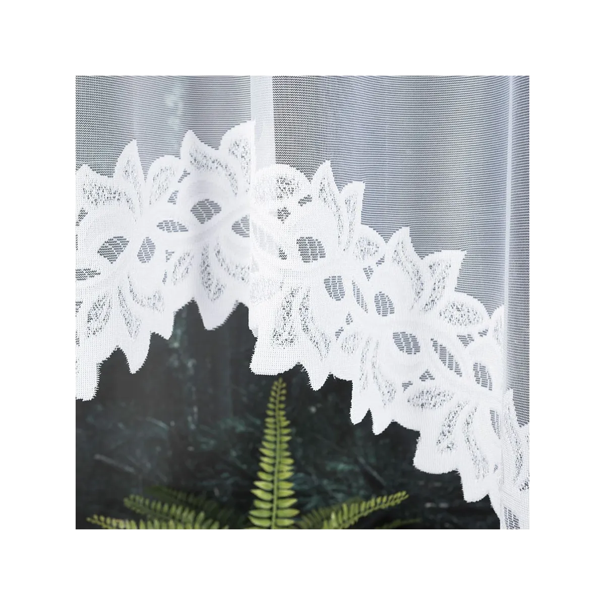 Model 648107/FBL to firana pojedyncza o rozmiarze 300x150 cm, wykonana z dzianiny żakardowej (100% poliester) o gramaturze 80–90 g/m². Góra jest wykończona fabrycznie (bez taśmy), dzięki czemu firankę wygodnie zawiesisz na żabki. Boki mają fabryczne wykończenie i nie wymagają obszycia, a dół jest laserowo wytapiany – całość prezentuje się schludnie i estetycznie.