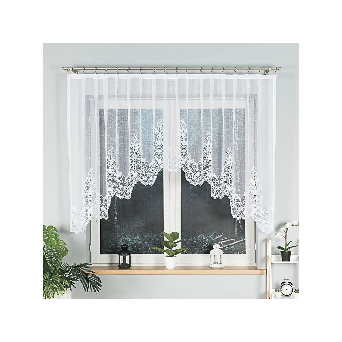 - Klasyczny styl – biała firanka z ornamentami wprowadza ponadczasową elegancję.