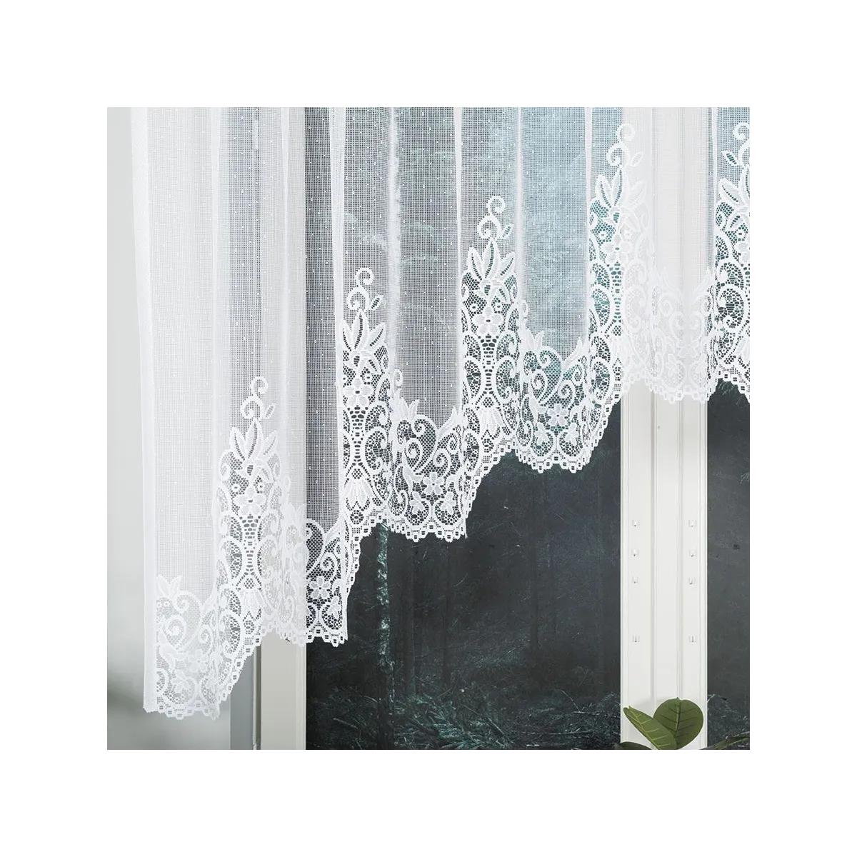 Gotowa firanka żakardowa BERENIKA to klasyczny wybór do eleganckiej aranżacji okna – biała, lekka i dekoracyjna, z efektownym podcięciem u dołu.