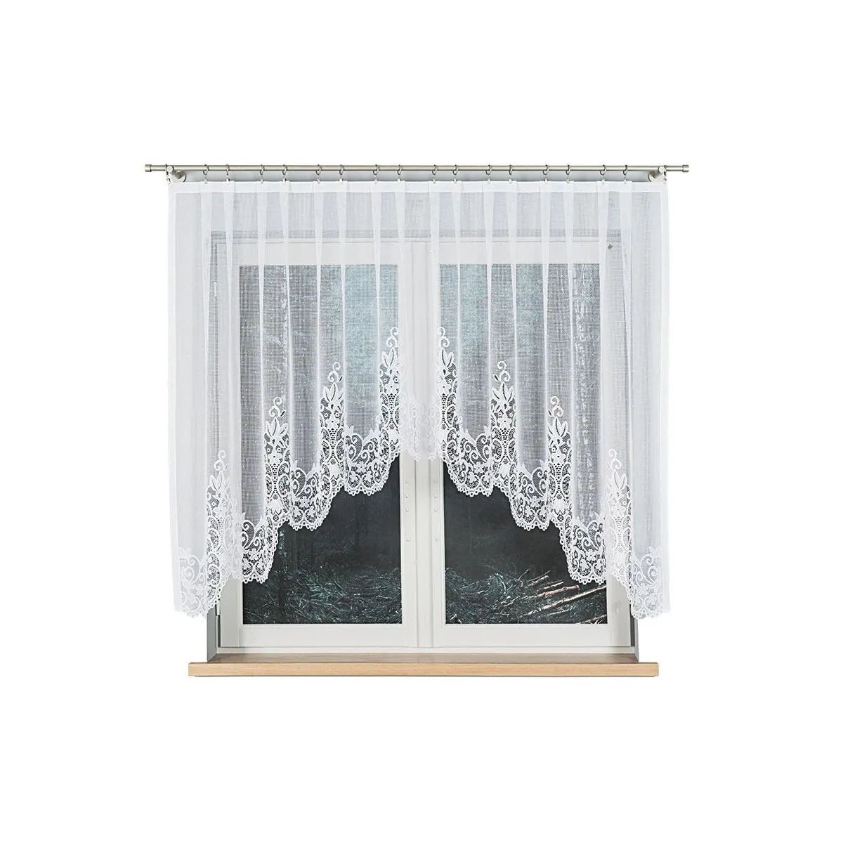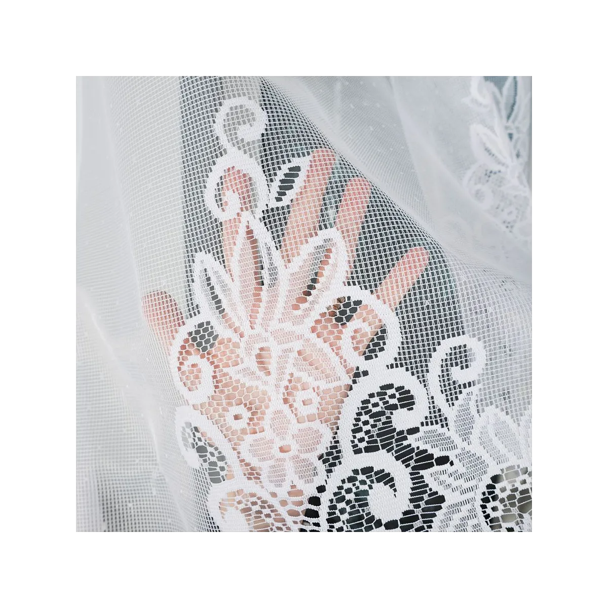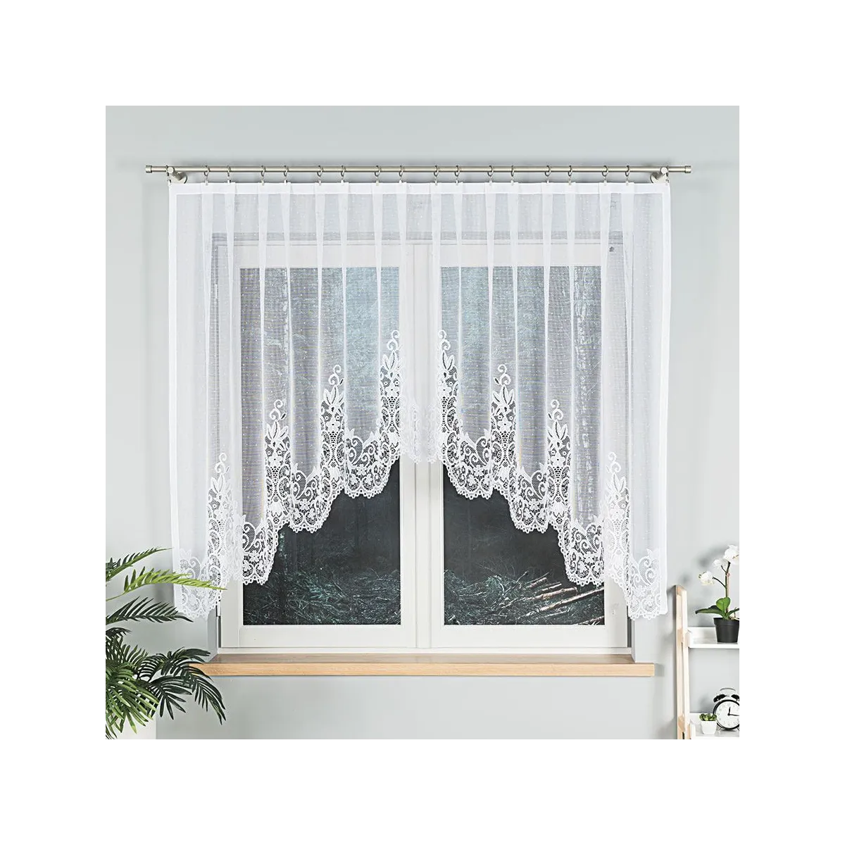 Firanka BERENIKA świetnie wygląda w salonie, sypialni, jadalni czy domowym gabinecie. Klasyczny wzór ornamentów i biel optycznie rozjaśniają przestrzeń, a podcięcie na dole szczególnie efektownie prezentuje się na oknach w kuchni lub w pomieszczeniach, gdzie zależy Ci na dekoracyjnej, lżejszej formie.