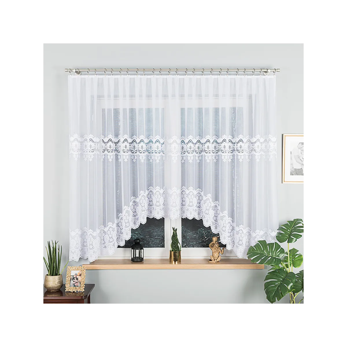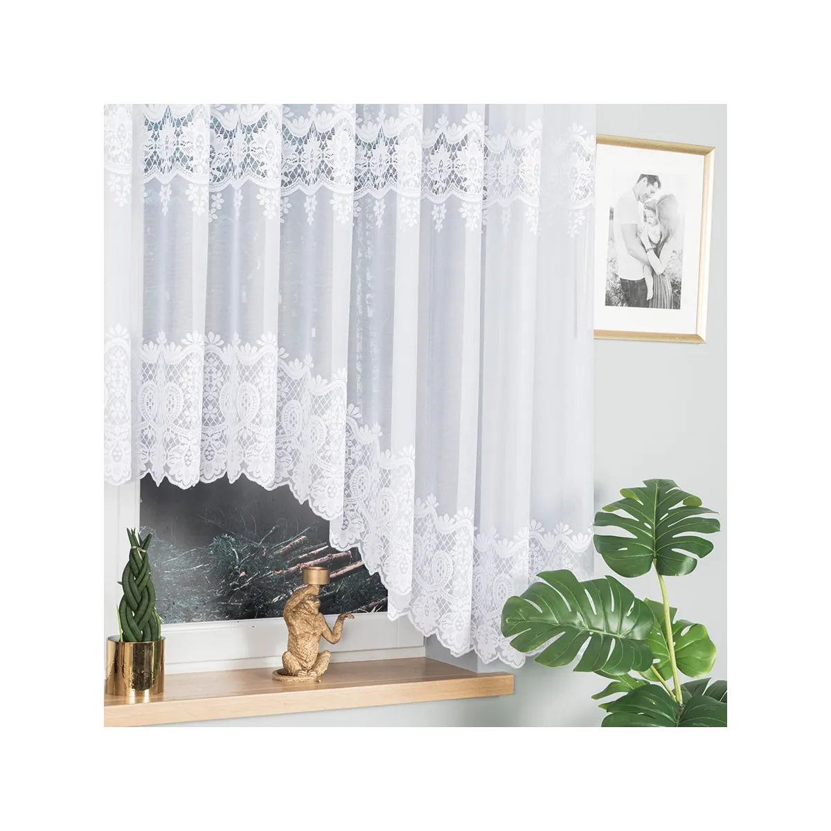 To uniwersalna firanka do salonu, sypialni, jadalni czy domowego gabinetu – szczególnie tam, gdzie chcesz zachować jasność i lekkość aranżacji, a jednocześnie dodać wnętrzu klasycznego akcentu. Dzięki tolerancji wymiaru +/- 3% łatwiej dopasujesz ją do okna i sposobu upięcia.