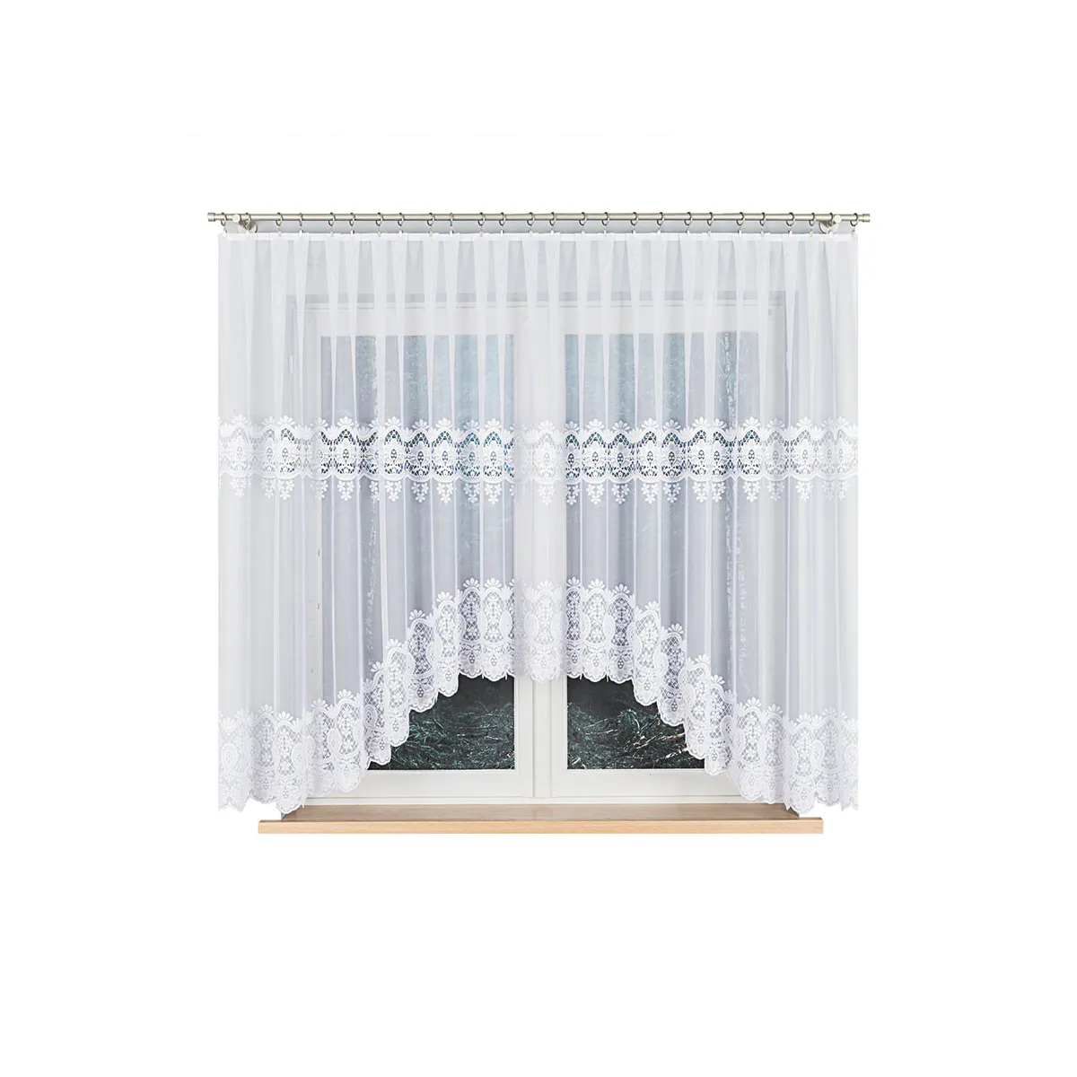 Biała firana pojedyncza z dzianiny żakardowej wyróżnia się dekoracyjnym podcięciem oraz ornamentowym wzorem, który pięknie prezentuje się na tle światła dziennego. Rozmiar 500x160 cm pozwala efektownie zaaranżować szerokie okno, a lekka gramatura 80–90 g/m² zapewnia zwiewność i estetyczne układanie się tkaniny. Firanka ma fabryczne wykończenie góry (bez taśmy) i jest przeznaczona do zawieszenia na żabki.