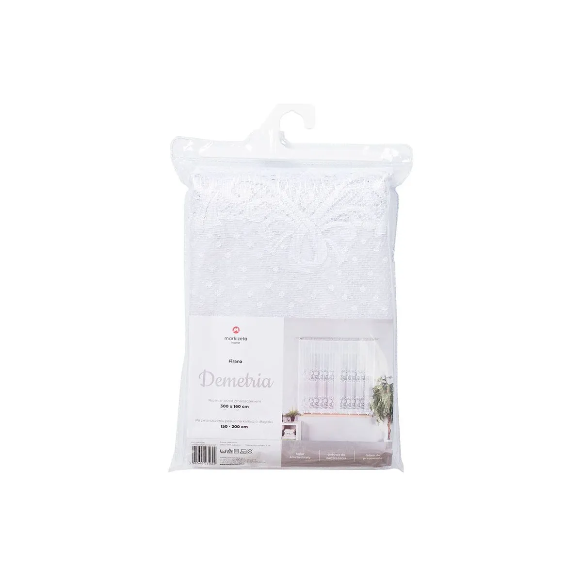 Model w rozmiarze 250x80 cm jest pojedynczą firaną przeznaczoną do zawieszenia na żabki. Wykonanie z dzianiny żakardowej (100% poliester) o gramaturze 80–90 g/m² pozwala uzyskać delikatny, estetyczny efekt przy zachowaniu praktyczności na co dzień. Boki wykończone fabrycznie nie wymagają obszycia, góra jest bez taśmy, a dół wykończono laserowo (wytapiany), co podkreśla precyzję wzoru.