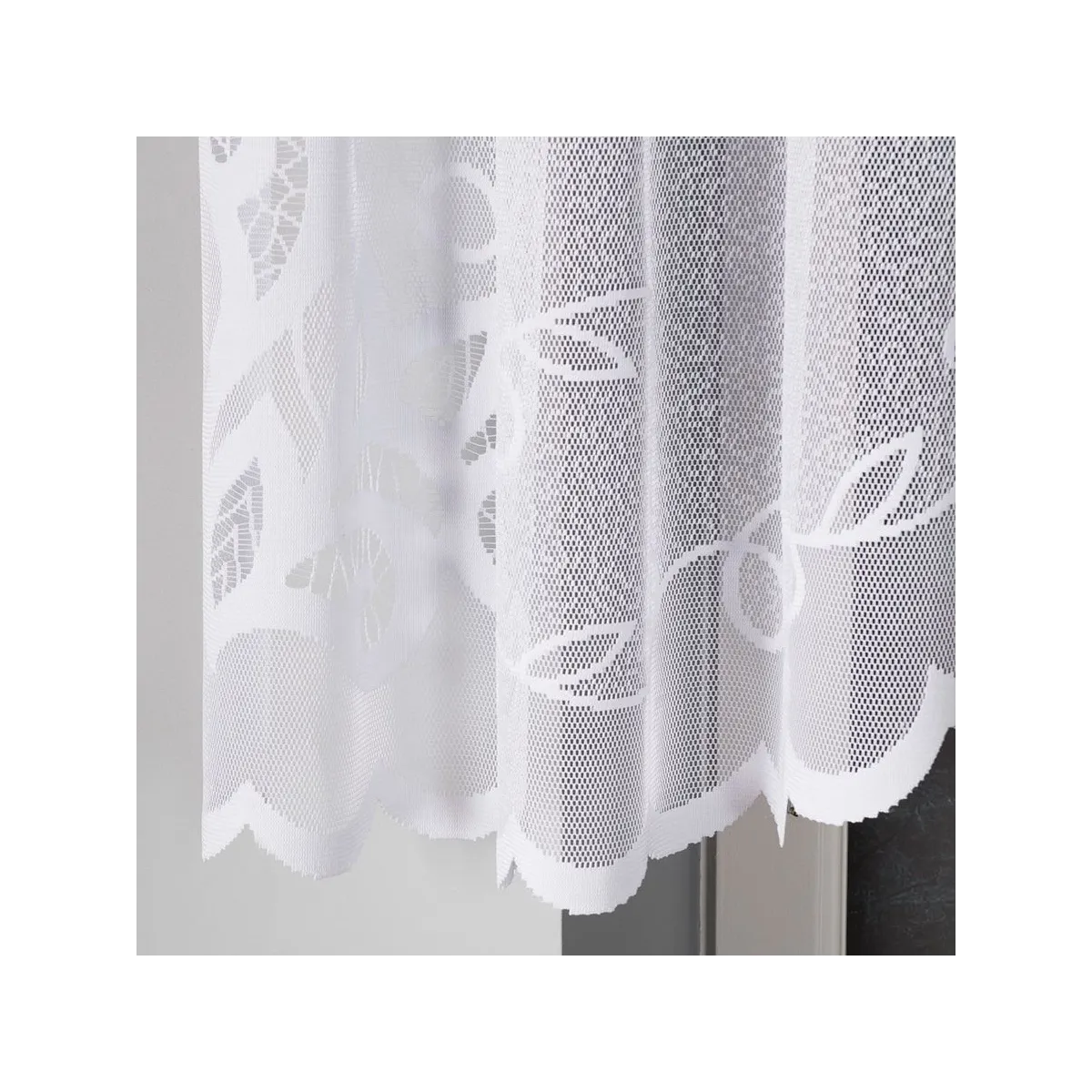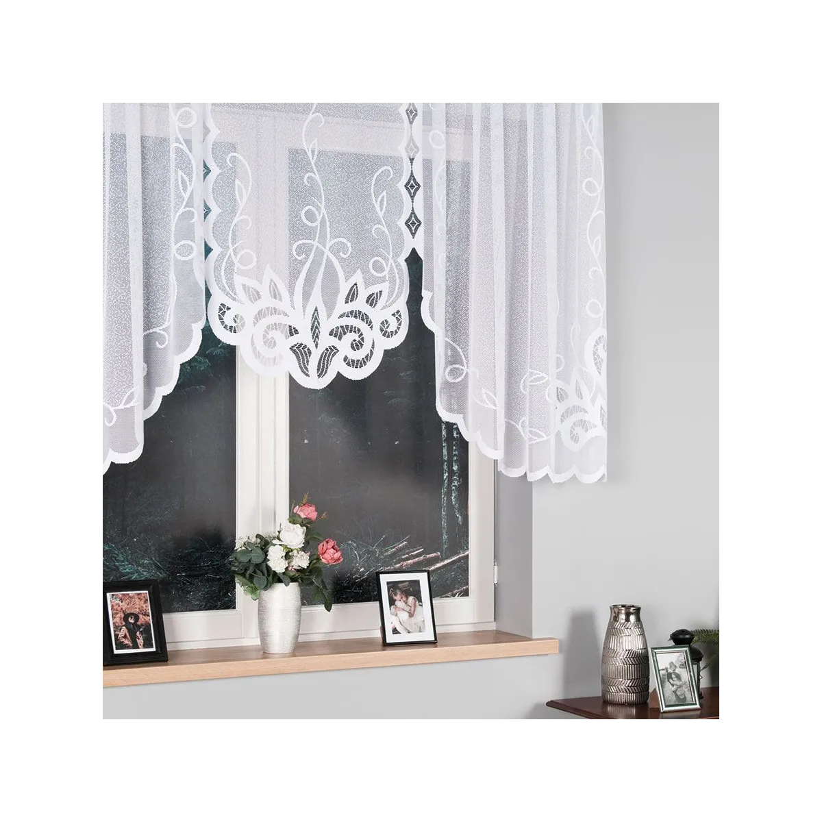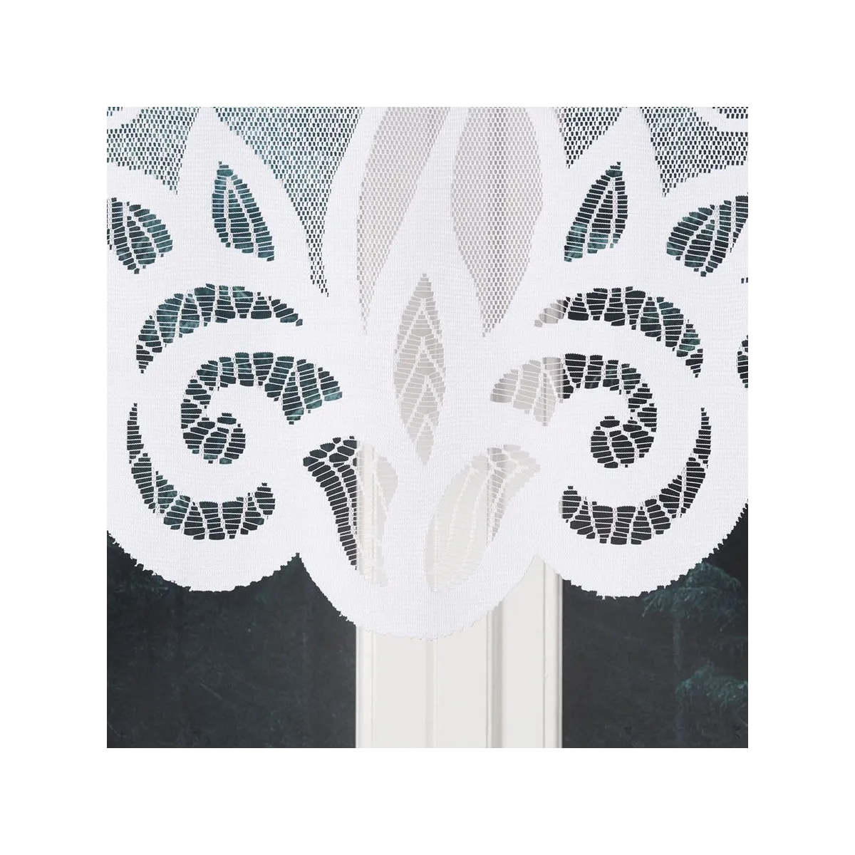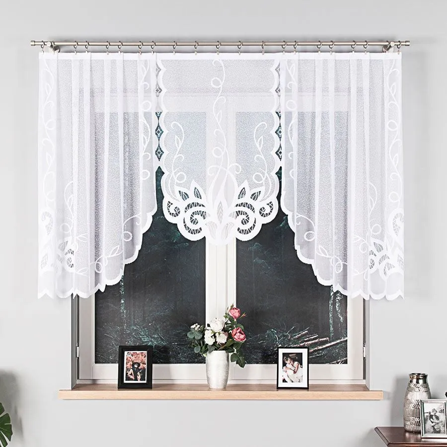 Biała firanka żakardowa Ewelina będzie świetnym wyborem do salonu, jadalni, kuchni lub sypialni. Ornamentowy wzór i podcięty dół dobrze wyglądają zarówno na standardowych oknach, jak i w zestawieniu z innymi dekoracjami okiennymi.