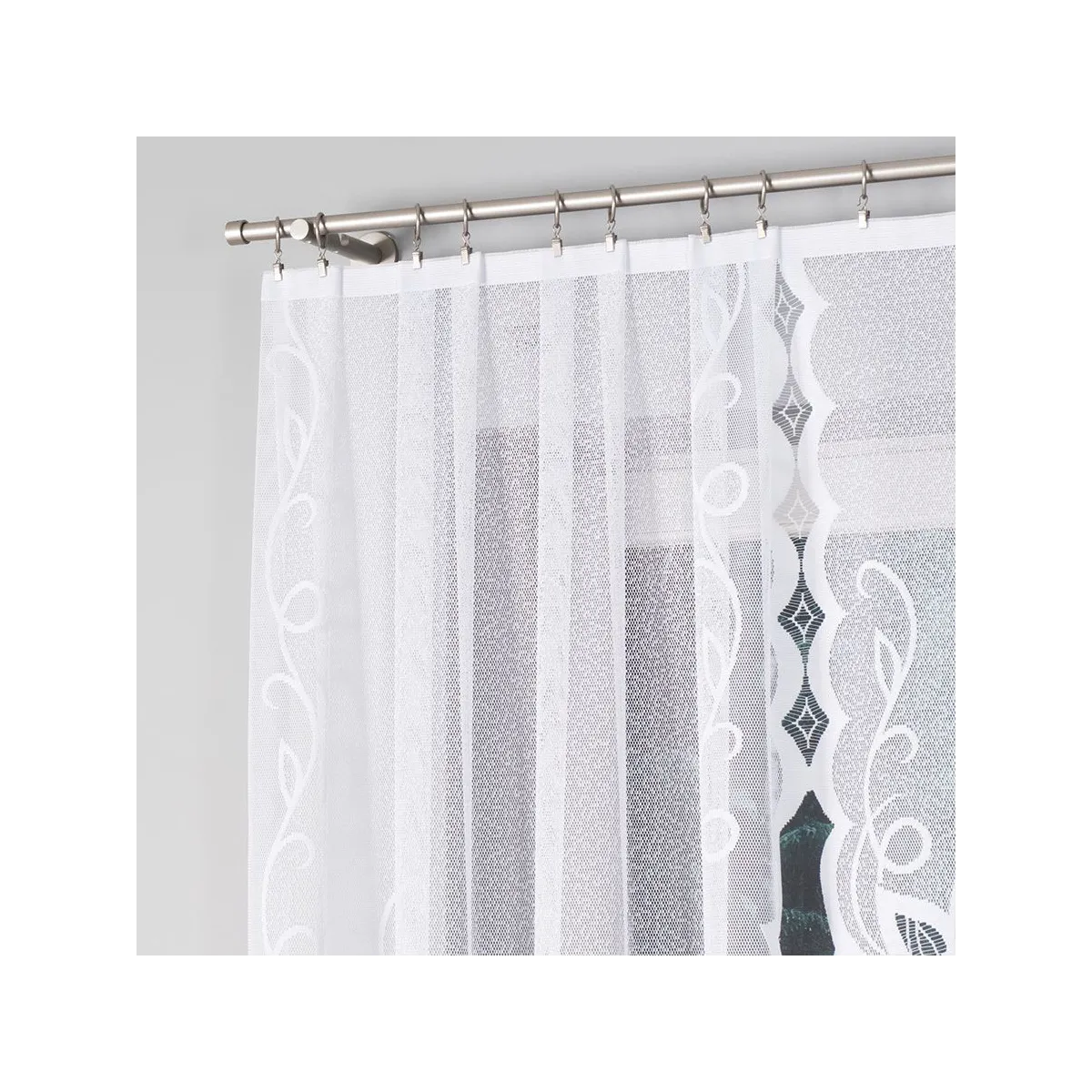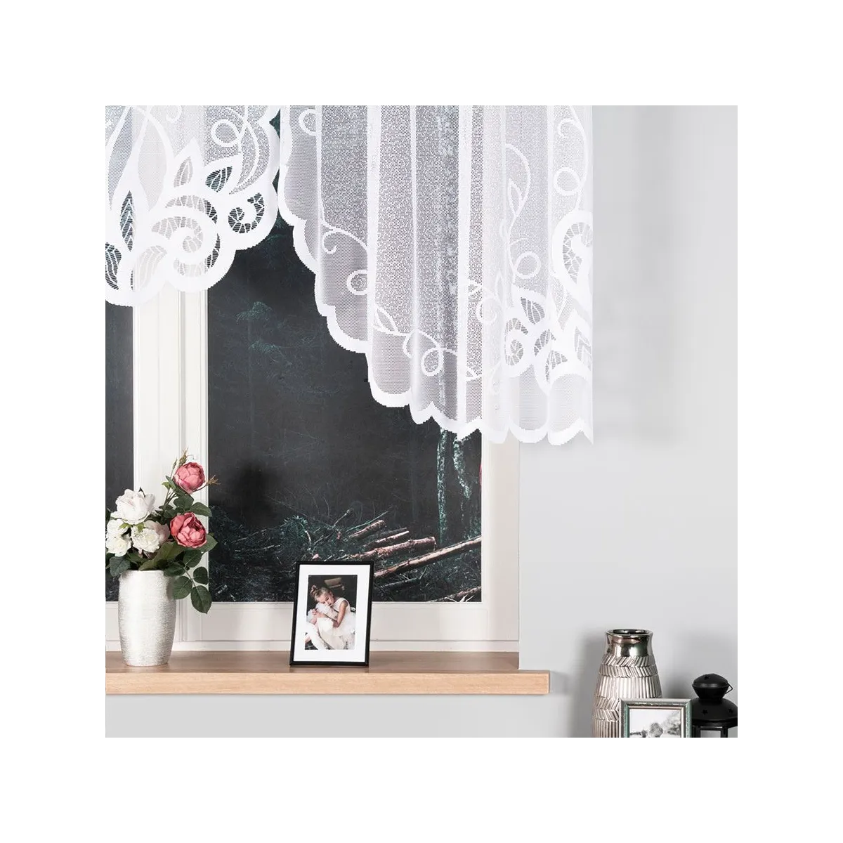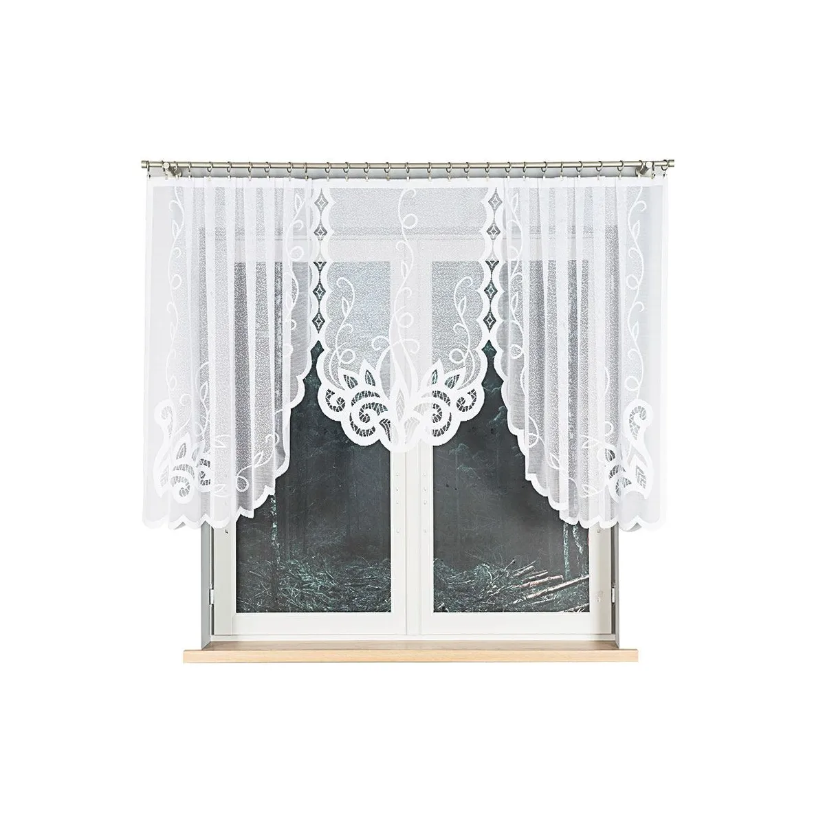 Biała firanka żakardowa Ewelina będzie świetnym wyborem do salonu, jadalni, kuchni lub sypialni. Ornamentowy wzór i podcięty dół dobrze wyglądają zarówno na standardowych oknach, jak i w zestawieniu z innymi dekoracjami okiennymi.