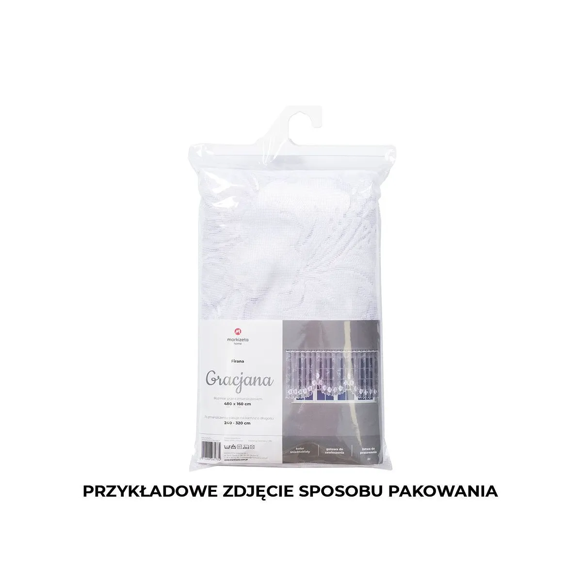 Model wykonano z dzianiny żakardowej (100% poliester) o gramaturze 80–90 g/m². Tkanina dobrze układa się w oknie i subtelnie rozprasza światło dzienne, tworząc przyjemną atmosferę. Firana jest pojedyncza, w rozmiarze 300x160 cm, z fabrycznym wykończeniem boków oraz górą bez taśmy — przeznaczona do zawieszenia na żabki. Dół wykończony laserowo wytapianą krawędzią dodaje całości lekkości i schludnego efektu.