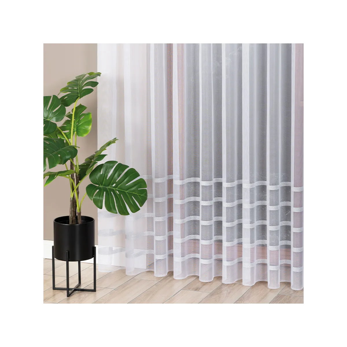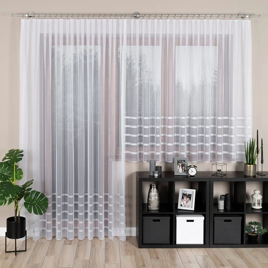 Szukasz dekoracji okiennej, która wpuści do Twojego domu mnóstwo naturalnego światła, a jednocześnie zapewni domownikom poczucie intymności? Firanka HALINA to propozycja, która łączy w sobie lekką strukturę siateczki z wyrazistym, geometrycznym motywem poziomych pasów. Jej minimalistyczny design sprawia, że wnętrze staje się optycznie powiększone i pełne świeżości. Dzięki imponującej wysokości 250 cm, firana pięknie prezentuje się w wysokich pomieszczeniach oraz na dużych przeszkleniach, tworząc harmonijną taflę bieli.
