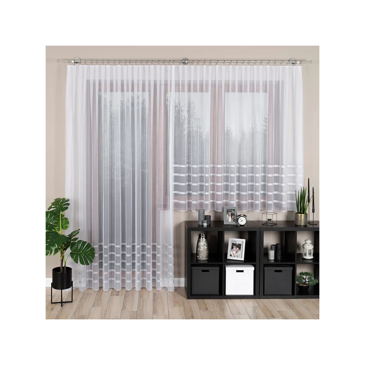 - Łatwy montaż: Firanka jest gotowa do zawieszenia bezpośrednio na żabkach, co pozwala na szybką i bezproblemową metamorfozę Twojego salonu czy sypialni.