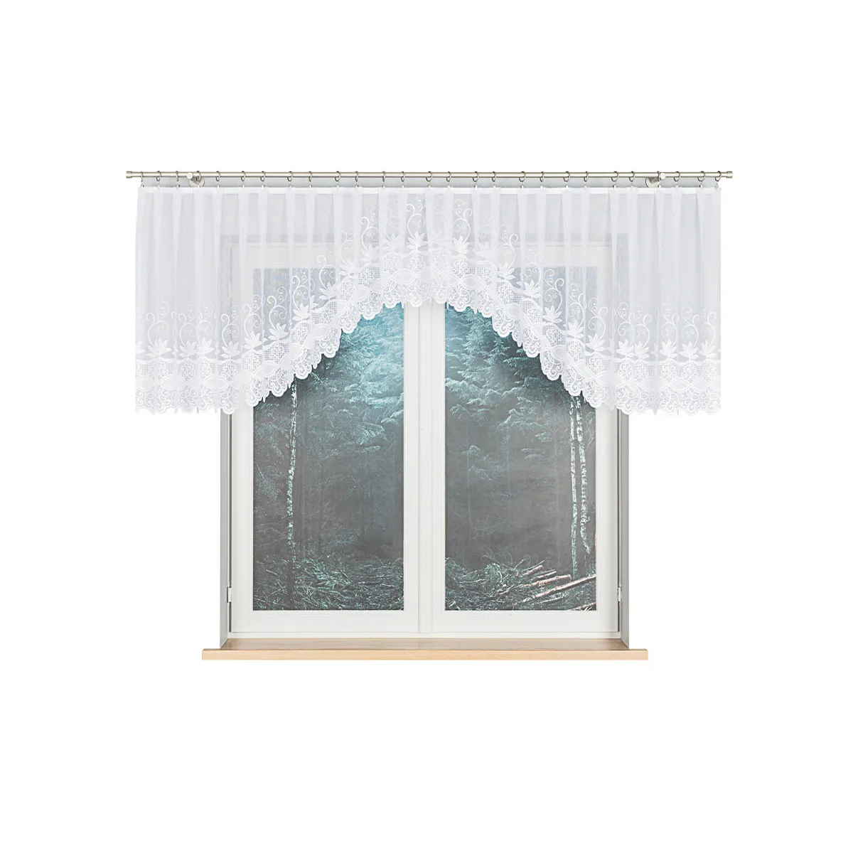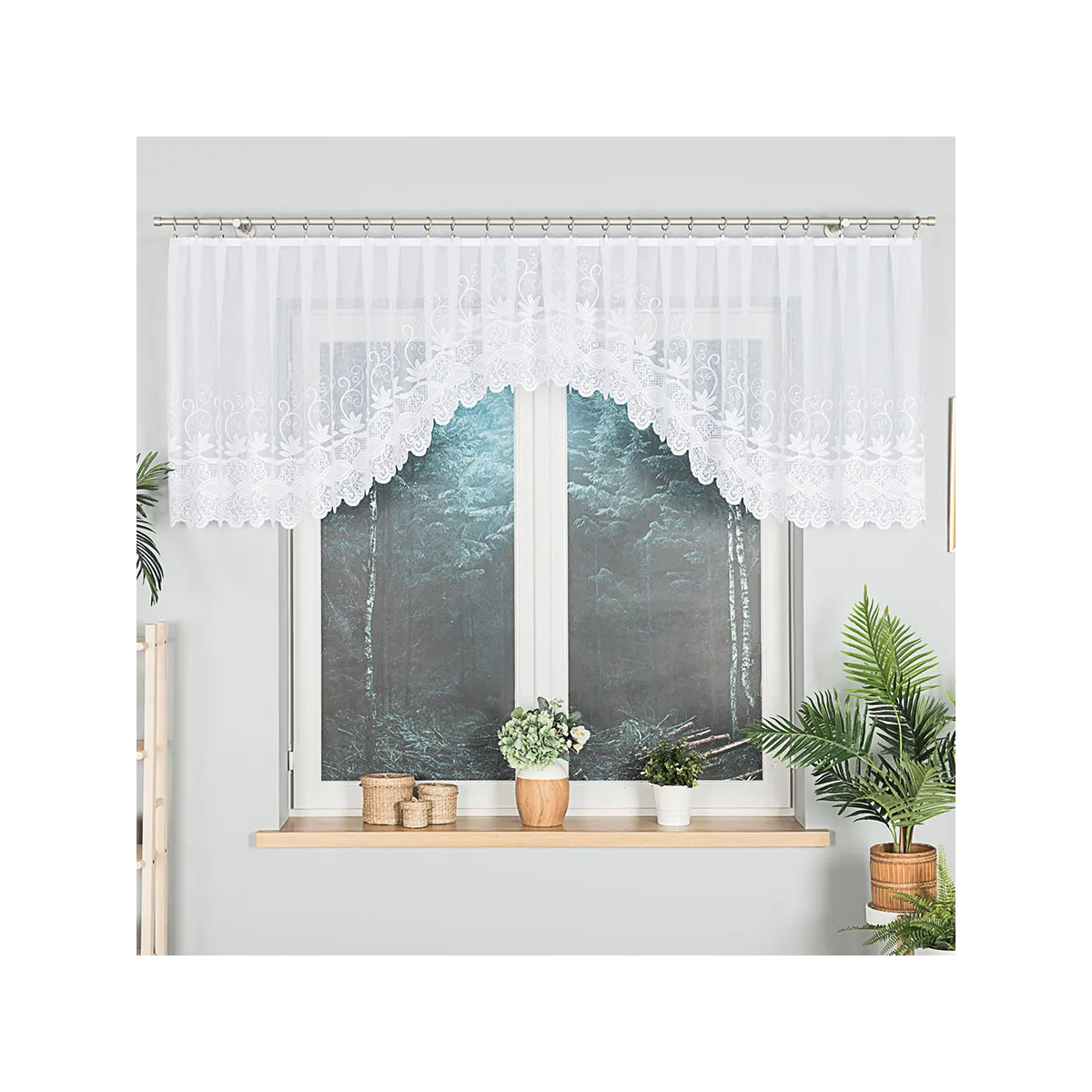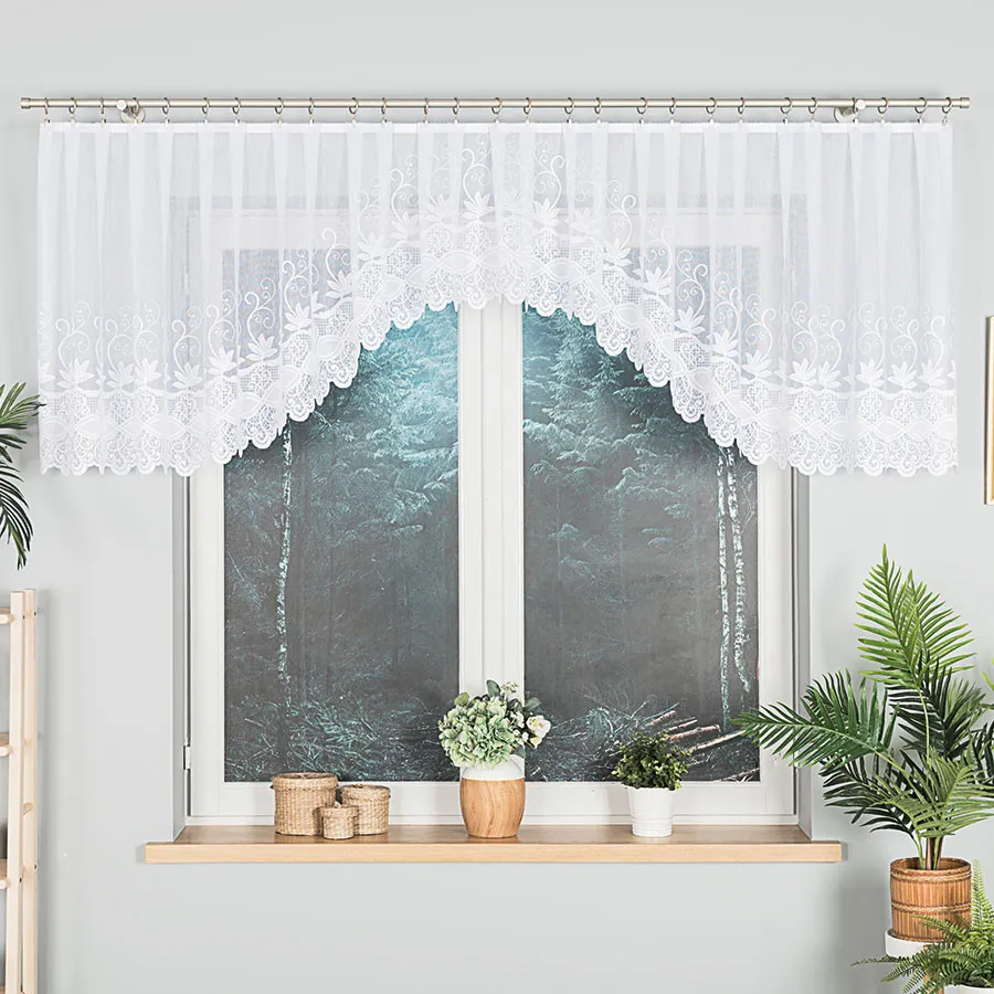Rozmiar 400x80 cm czyni ją dobrym wyborem do salonu, jadalni czy kuchni, szczególnie na szerokie okna, gdzie chcesz uzyskać dekoracyjny efekt bez nadmiernego zaciemnienia. Biała dzianina żakardowa i kwiatowy wzór harmonijnie współgrają z drewnem, bielą oraz pastelami.