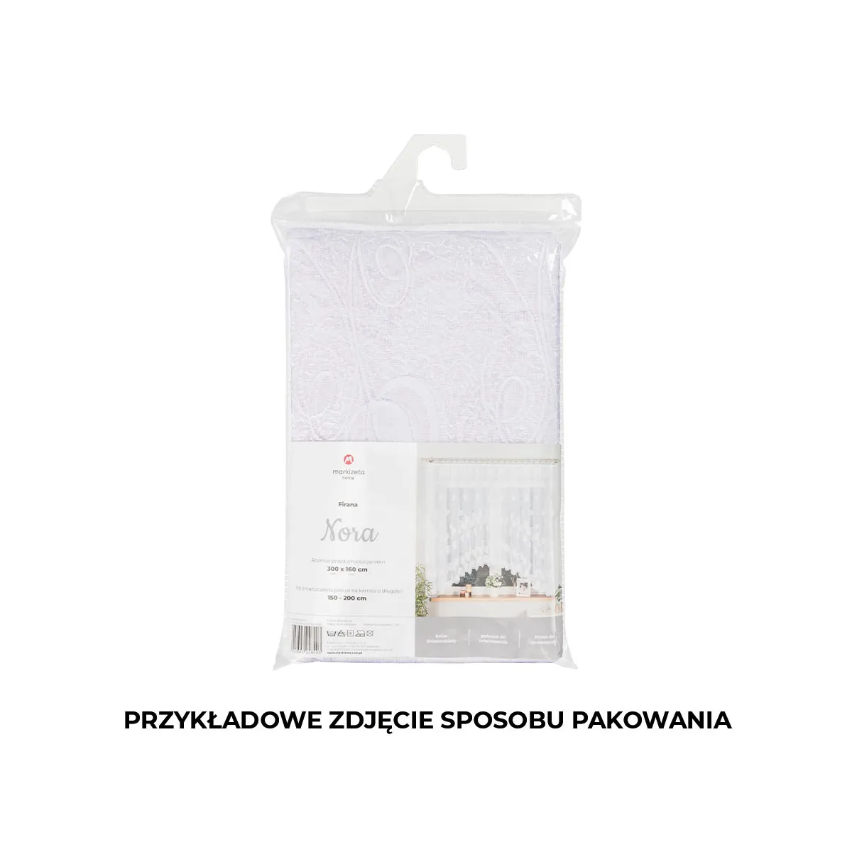 Model wykonano z dzianiny żakardowej o gramaturze 80–90 g/m² i składzie 100% poliester. Firana jest pojedyncza, ma wymiary 400x80 cm (tolerancja +/- 3%) i została przygotowana tak, by wyglądać estetycznie od razu po wyjęciu z opakowania: boki mają wykończenie fabryczne, a dolna krawędź jest laserowo wytapiana. Góra pozostaje fabryczna, bez taśmy, dzięki czemu zawiesisz ją na żabki w prosty sposób.