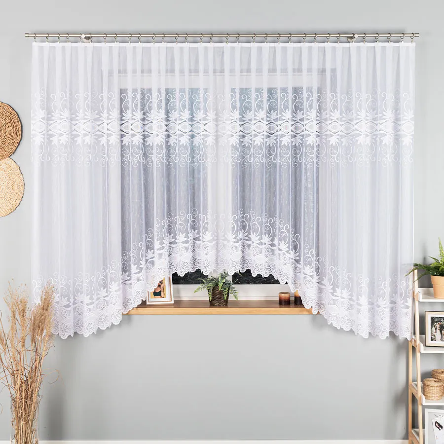 Rozmiar 520x180 cm dobrze pasuje do szerokich okien w salonie, jadalni lub kuchni, gdzie zależy Ci na jasnej, lekkiej dekoracji. Klasyczny charakter i żakardowa struktura pozwalają łatwo zestawić firankę z zasłonami w różnych kolorach oraz z prostymi roletami.