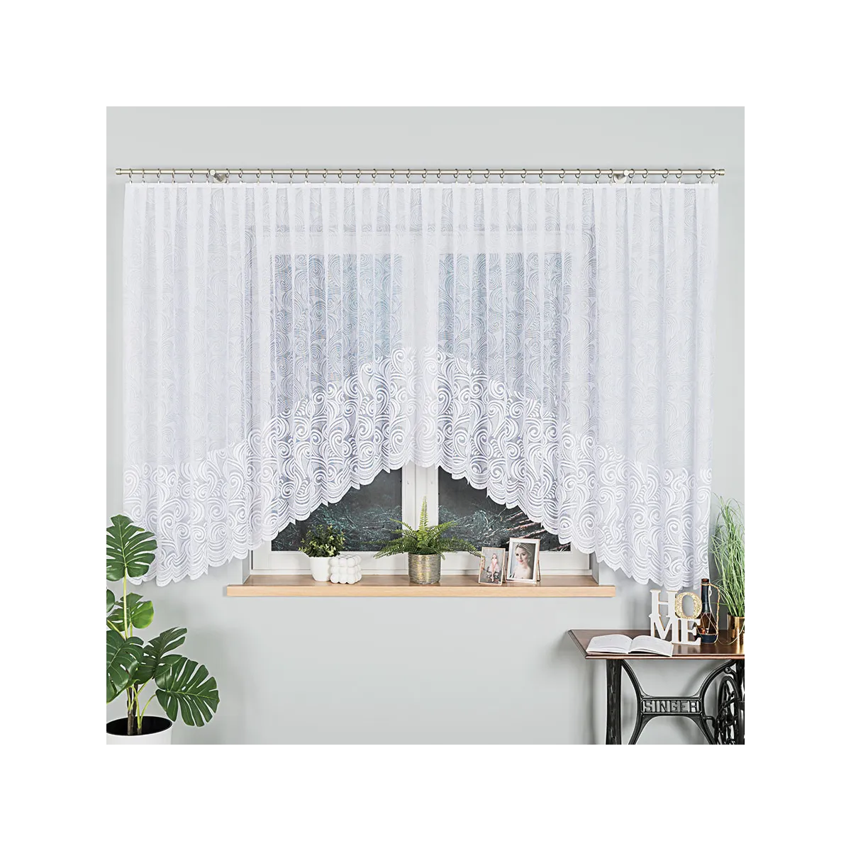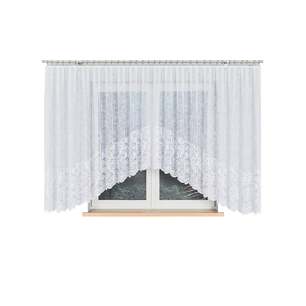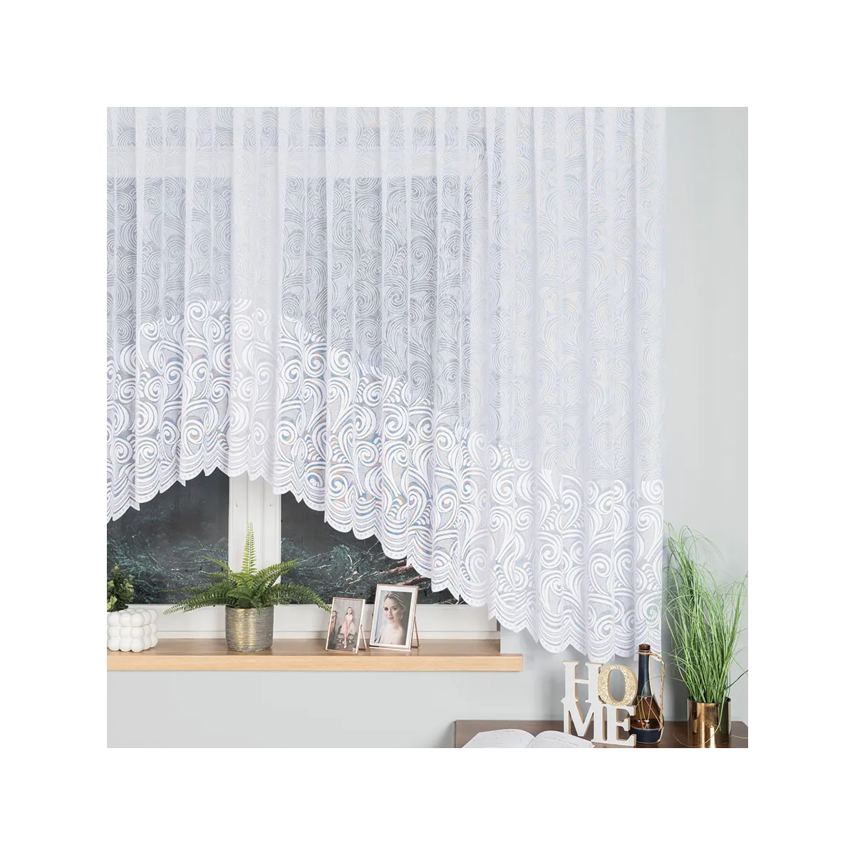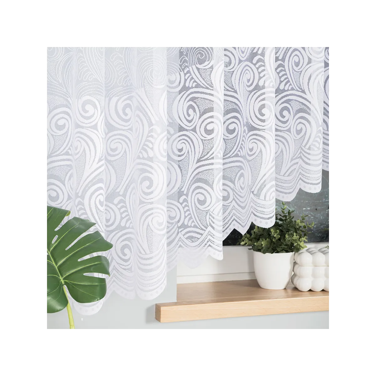 Firanka gotowa żakardowa KINGA to klasyczna propozycja do salonu, kuchni lub jadalni, gdy zależy Ci na eleganckim wyglądzie i szybkim montażu. Biała dzianina żakardowa z ornamentowym wzorem tworzy lekką, dekoracyjną zasłonę okna, a podcięcie na dole dodaje całości wyrafinowanego charakteru.