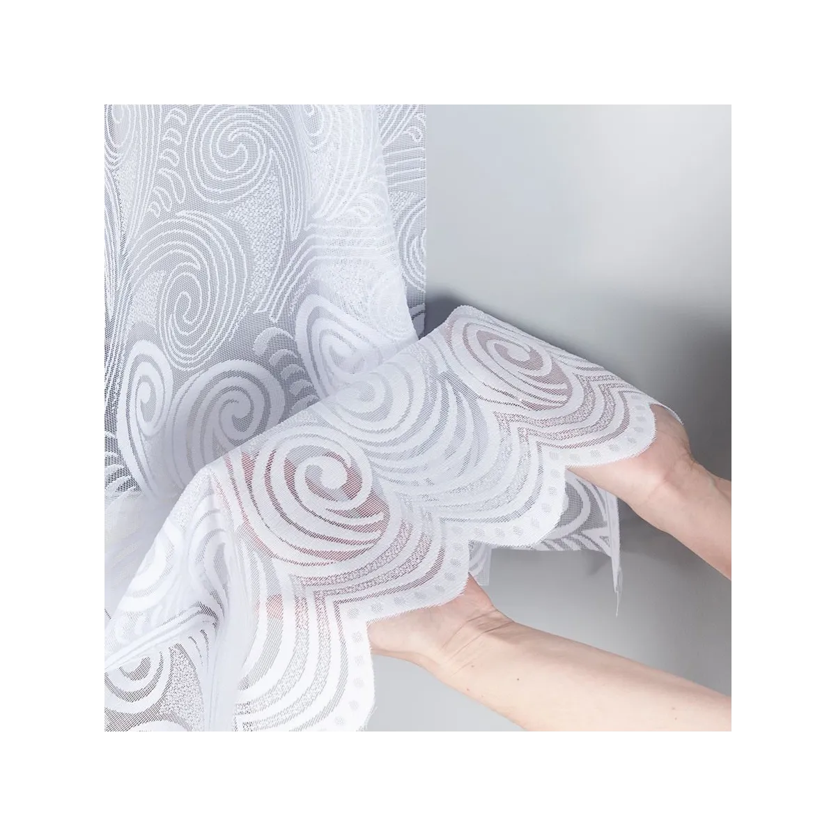 Model w rozmiarze 530x160 cm to firana pojedyncza wykonana w 100% z poliestru, o gramaturze 80–90 g/m². Materiał dobrze się układa, a laserowo wytapiane wykończenie dołu podkreśla precyzję detalu. Firanka ma fabrycznie wykończone boki (nie wymagają obszycia) oraz górę bez taśmy i jest przeznaczona do zawieszania na żabki.