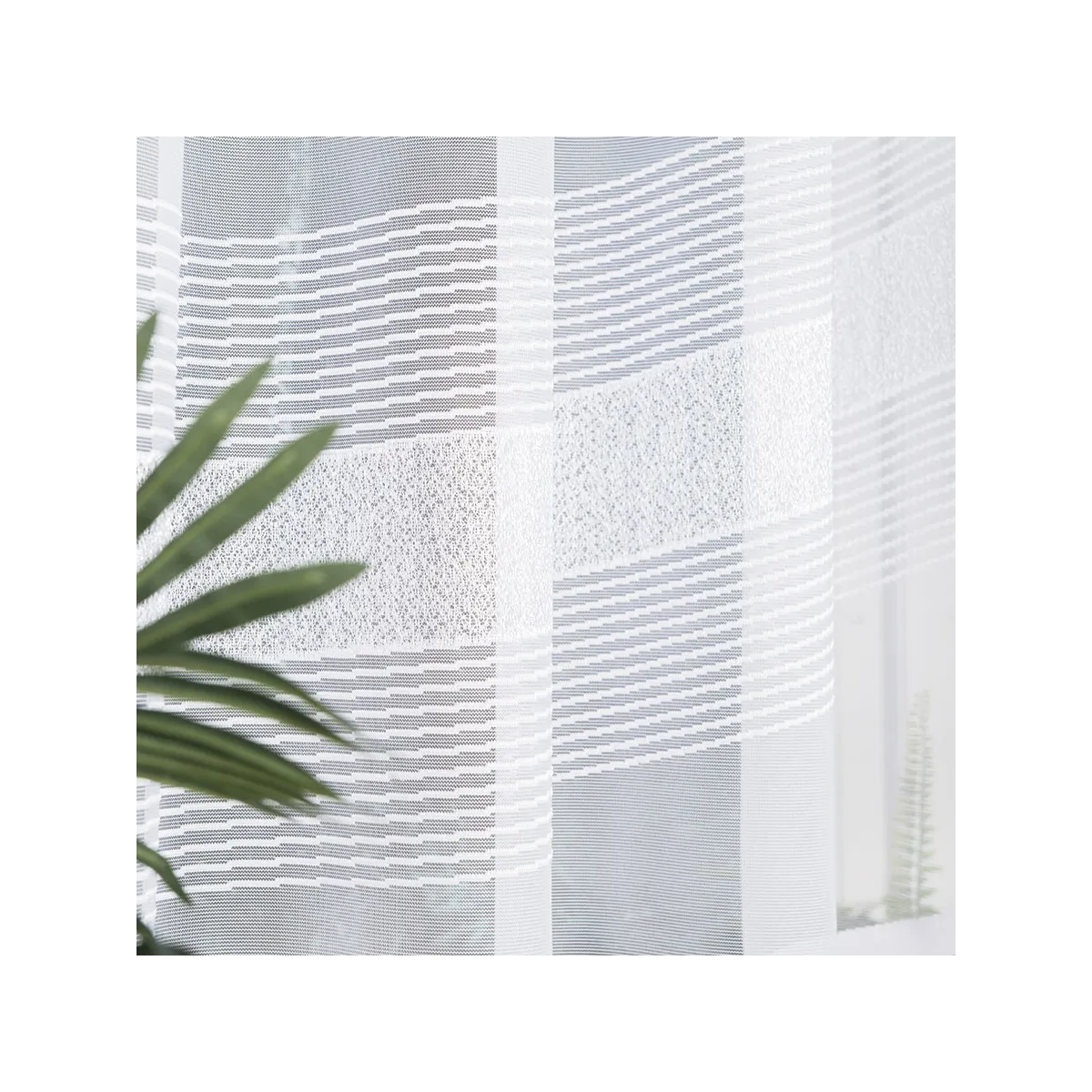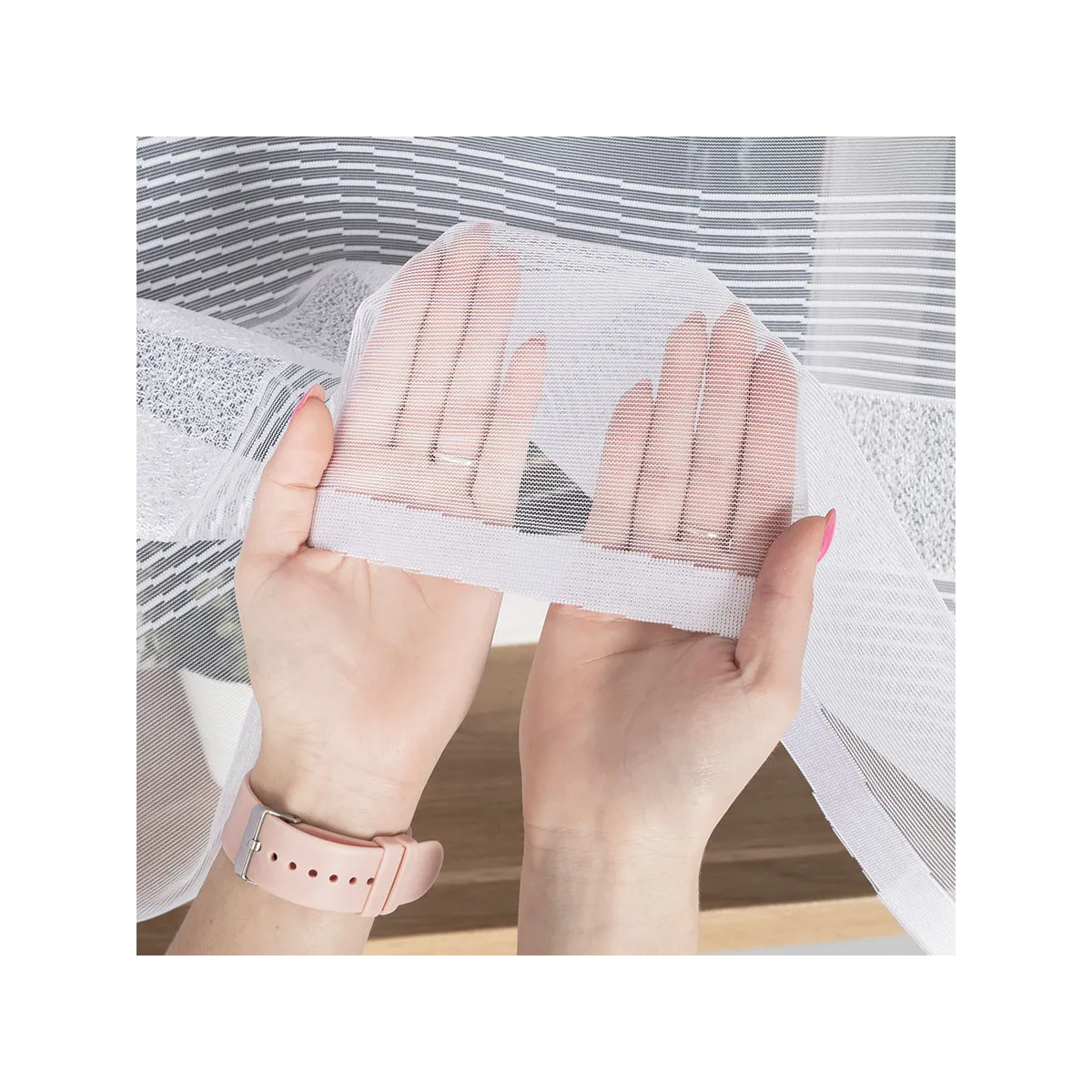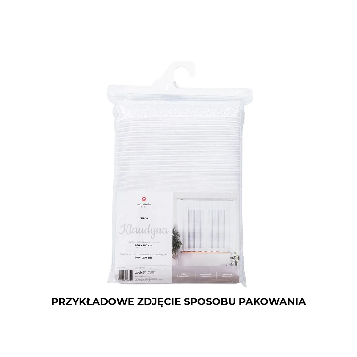 Model w rozmiarze 300x160 cm jest pojedynczą firaną wykonaną w 100% z poliestru o gramaturze 80–90 g/m². Materiał jest przyjemnie zwiewny, a jednocześnie praktyczny w codziennym użytkowaniu. Firanka ma fabryczne boki (nie wymagają obszycia), górę bez taśmy i jest przygotowana do zawieszenia na żabki. Dół wykończono laserowo wytapianą krawędzią, co podkreśla czyste linie wzoru i estetykę wykończenia.