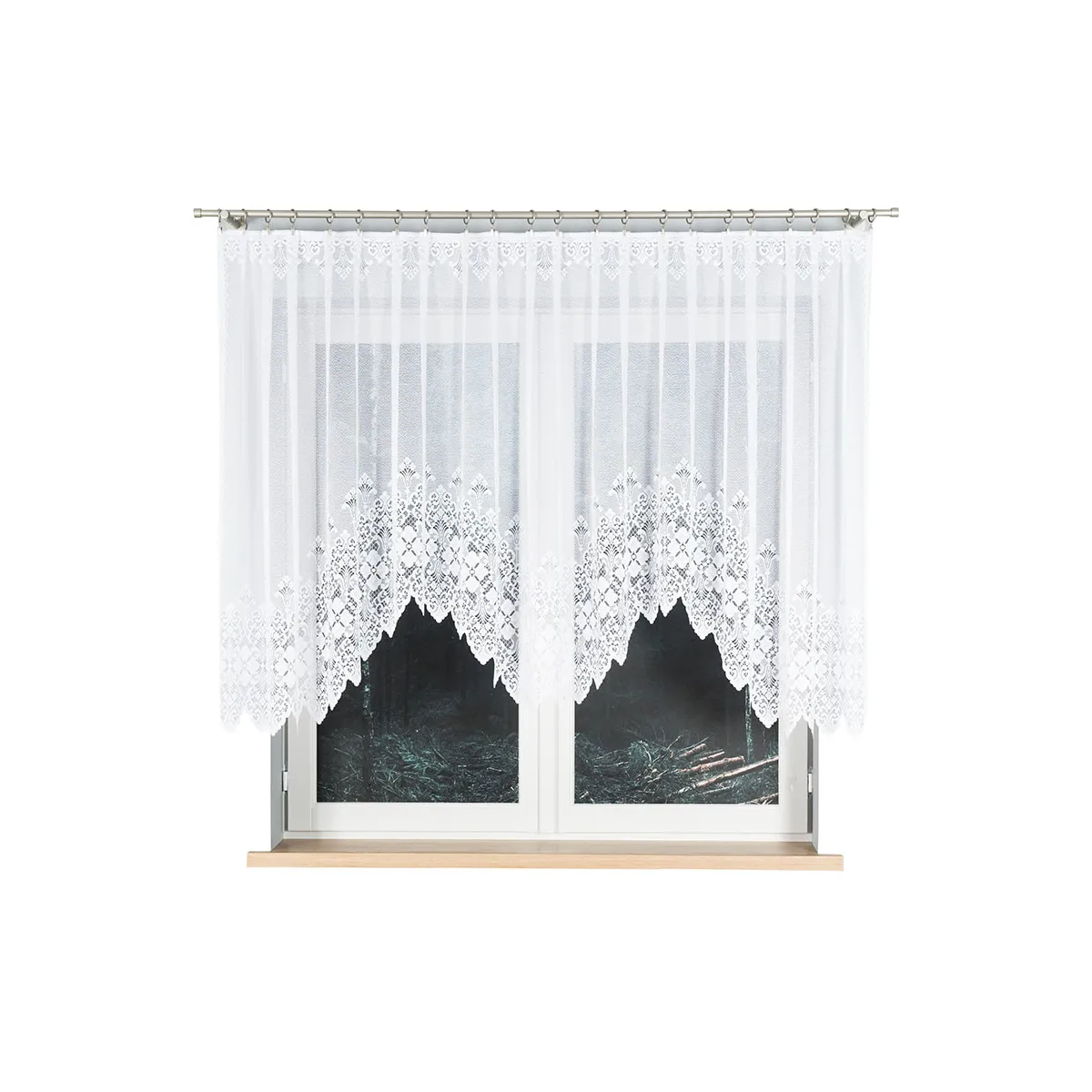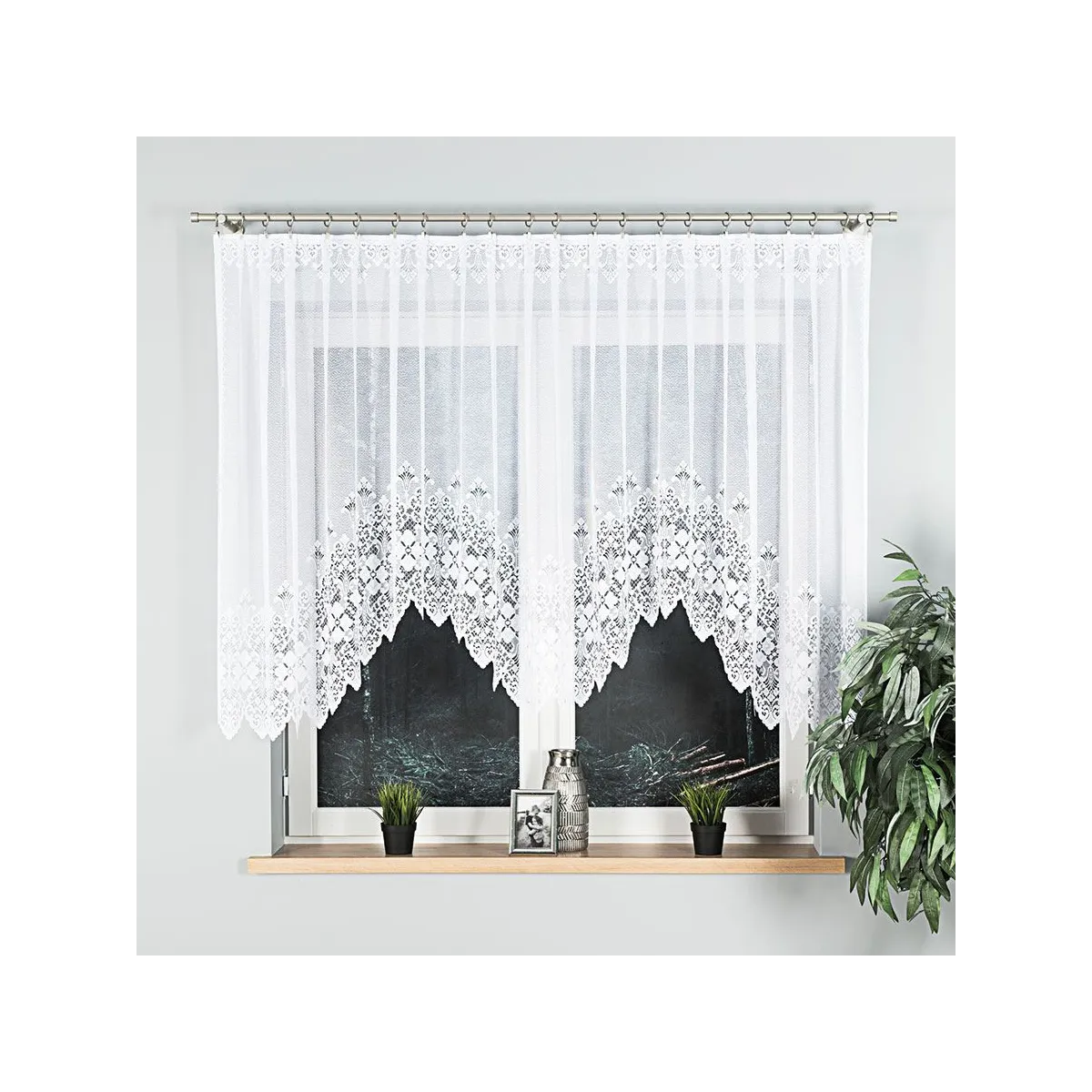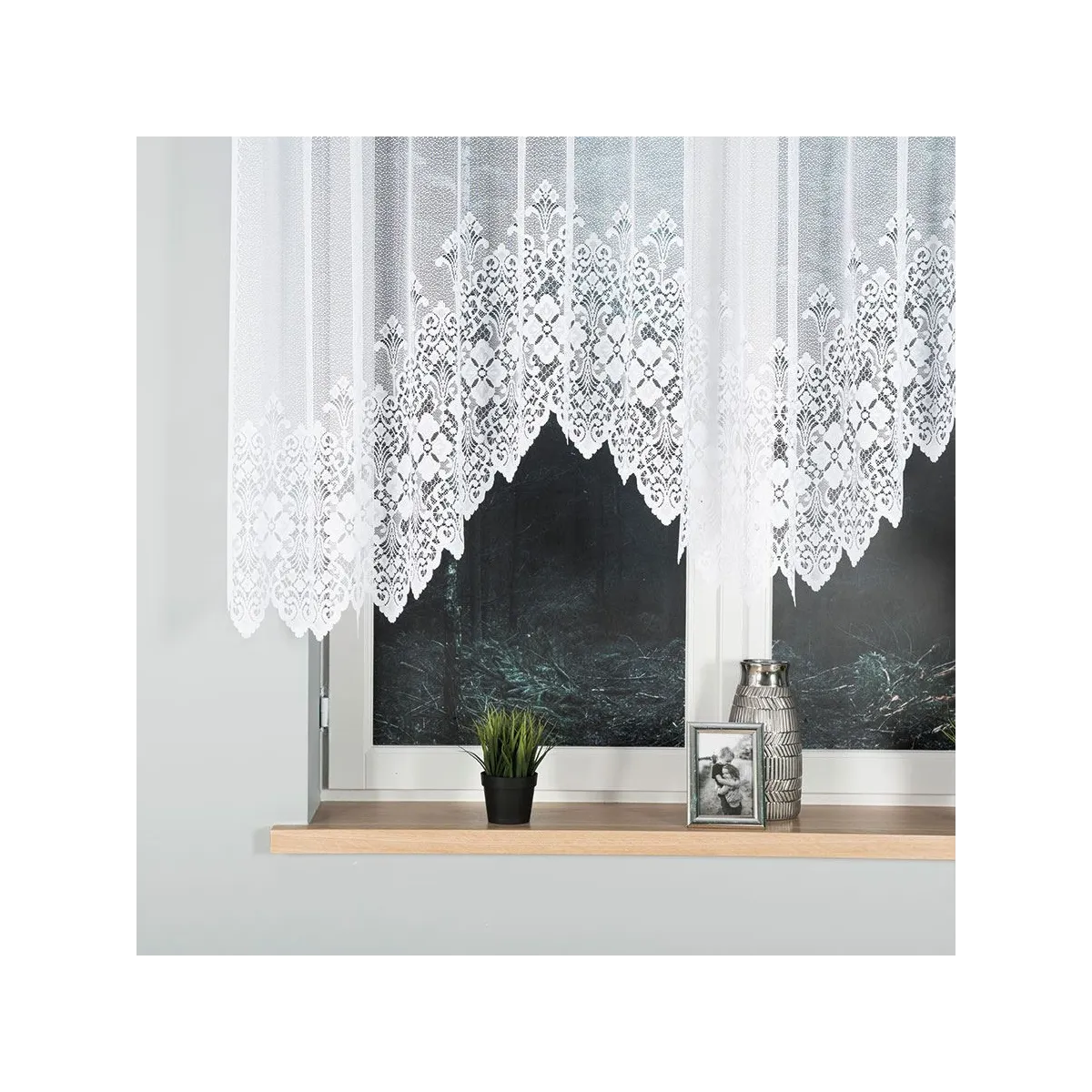 Firanka gotowa żakardowa NADIA to propozycja dla osób, które cenią klasyczną, jasną oprawę okna i dekoracyjny detal. Biały żakard z ornamentami subtelnie rozprasza światło, a ozdobne podcięcie na dole dodaje lekkości i elegancji.