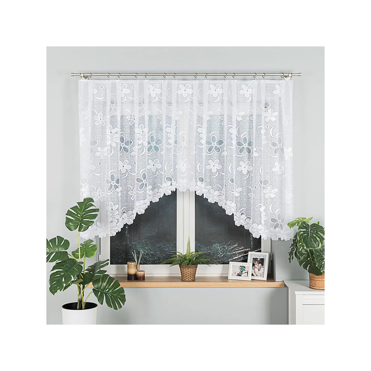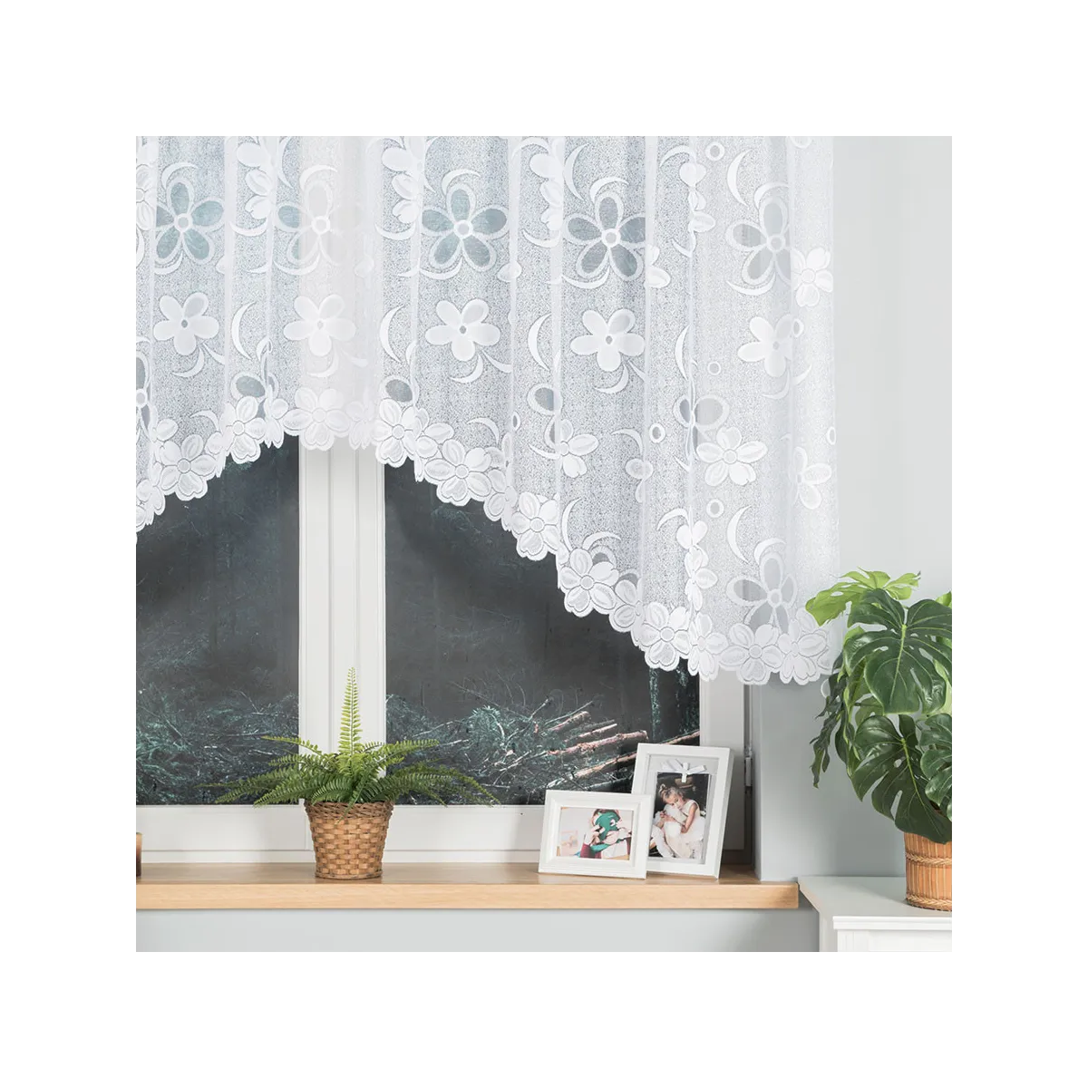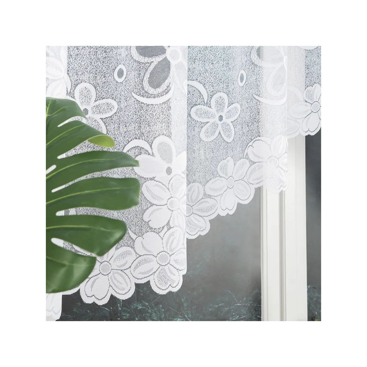 Rozmiar 300x130 cm i lekka dzianina żakardowa sprawiają, że firanka RENATA dobrze wygląda w kuchni, jadalni, salonie czy sypialni. Kwiatowy motyw ociepla przestrzeń, a biała kolorystyka nie przytłacza – subtelnie filtruje światło i podkreśla czystość aranżacji.