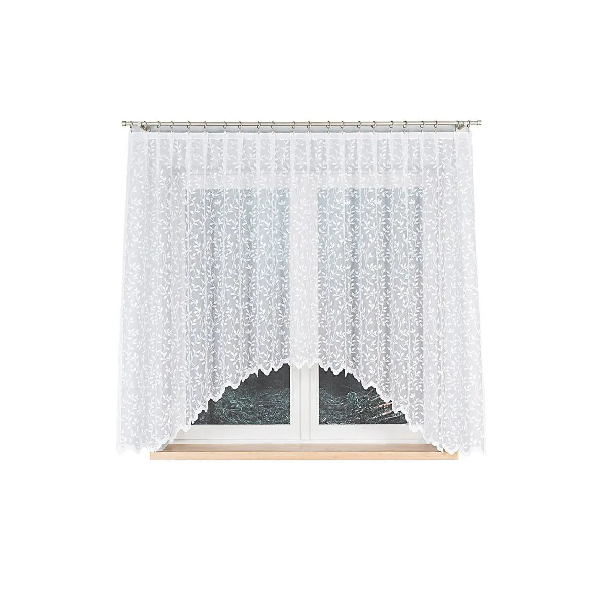 Model o wymiarach 300x160 cm to firana pojedyncza wykonana z dzianiny żakardowej (100% poliester) o gramaturze 80–90 g/m². Góra jest fabryczna, bez taśmy, dzięki czemu firankę wygodnie zawiesisz na żabki. Estetykę podkreślają fabrycznie wykończone boki (bez potrzeby obszywania) oraz dół laserowo wytapiany, który tworzy dekoracyjne podcięcie i równe, schludne wykończenie.