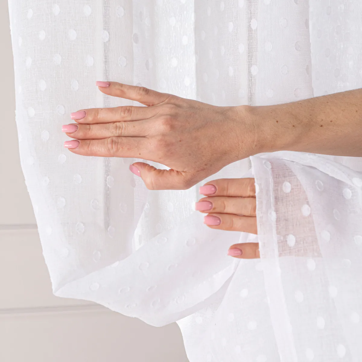 Firanka 424091 to połączenie klasycznej bieli z uroczym wzorem w groszki, który dodaje wnętrzu lekkości i wdzięku. Transparentna tkanina pięknie przepuszcza światło, rozświetlając przestrzeń i tworząc przytulną atmosferę. ✨
