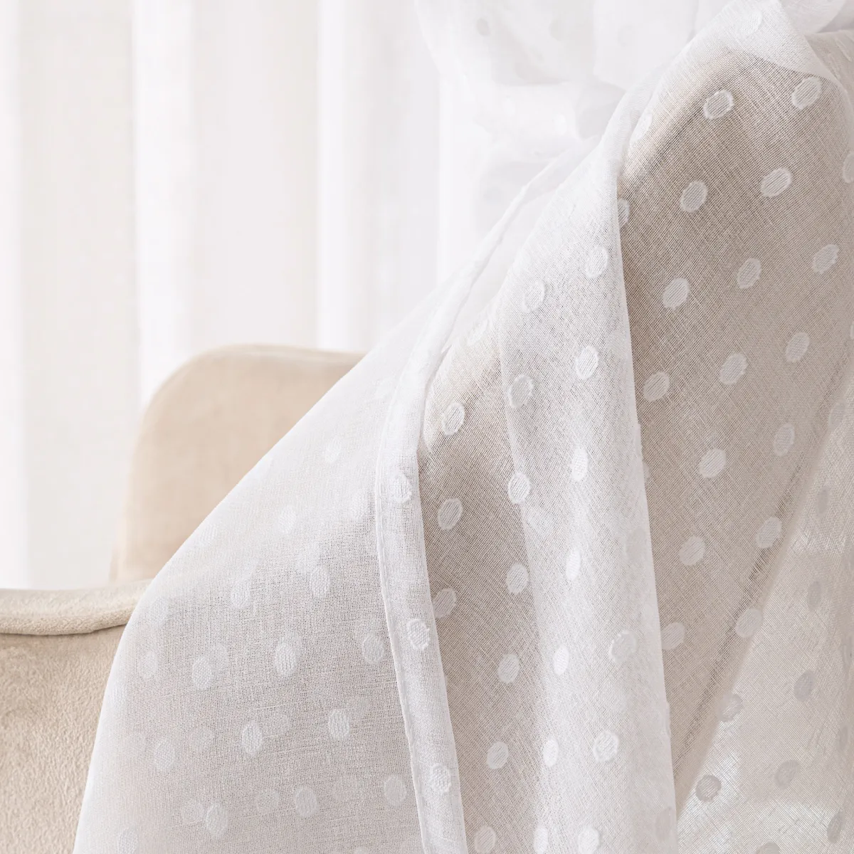 Jeśli szukasz firanki, która w subtelny sposób odmieni Twoje wnętrze, model 424091 będzie idealnym wyborem! Biała firanka z delikatnym wzorem w groszki i romantyczną koronką wprowadza do pomieszczenia przytulność i elegancję. ✨