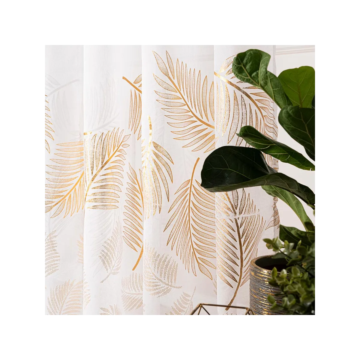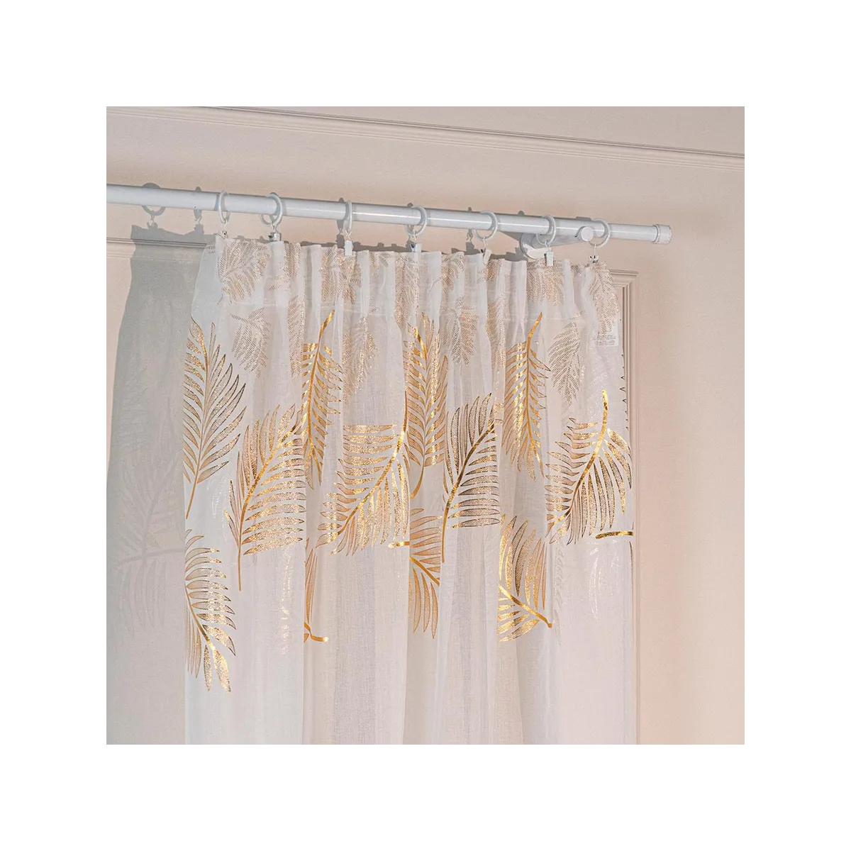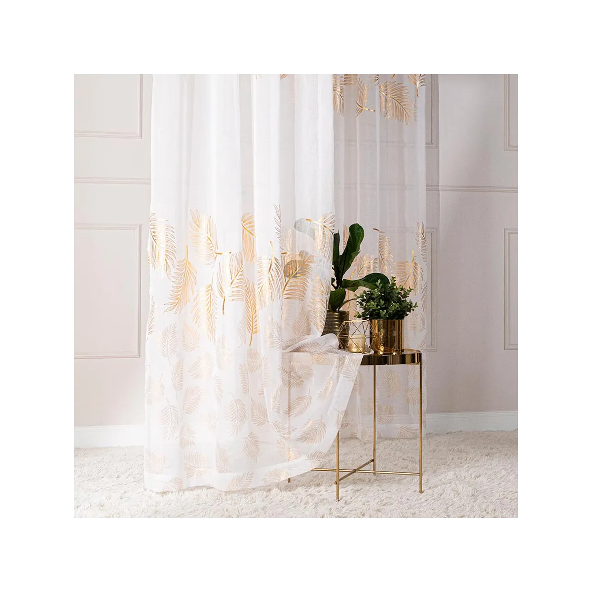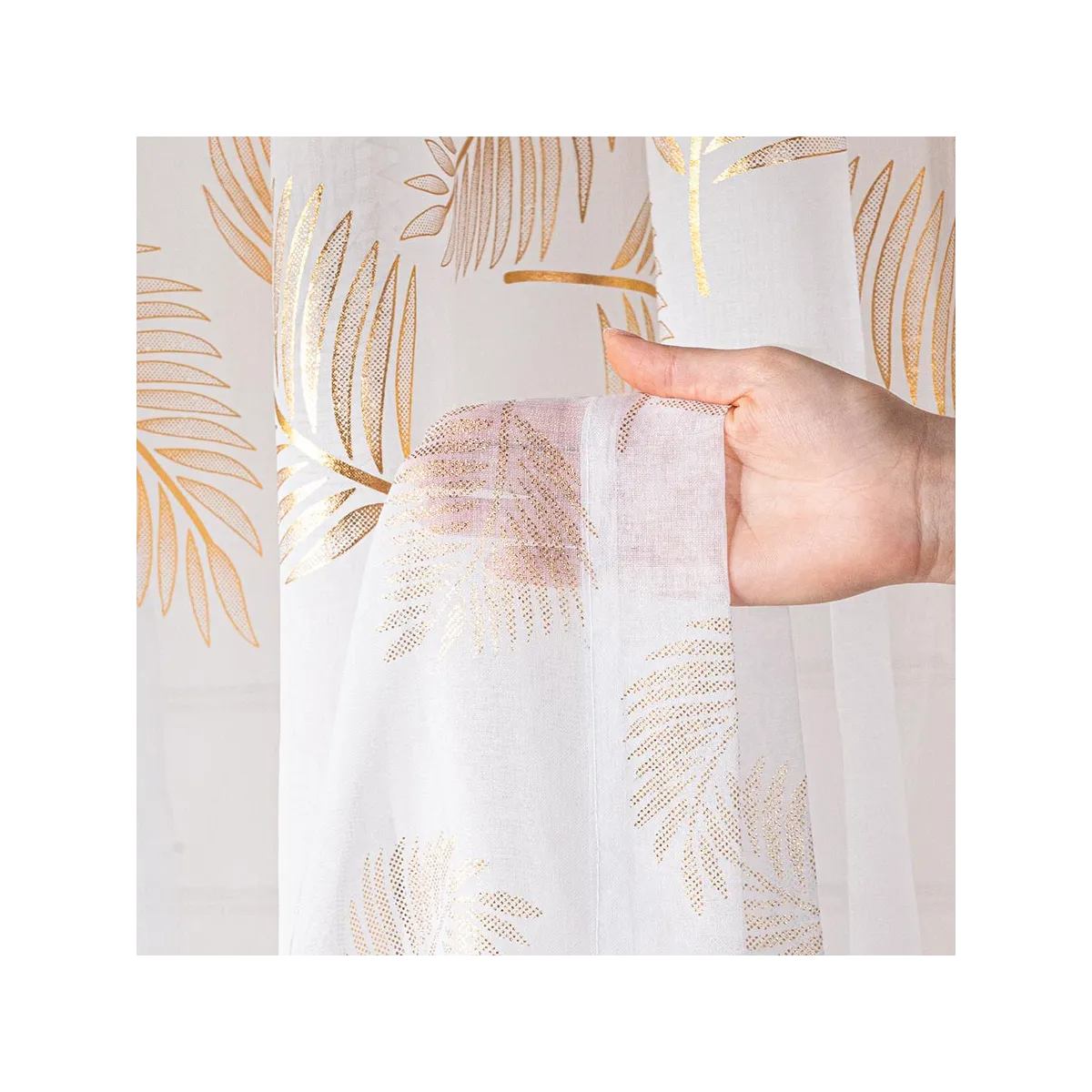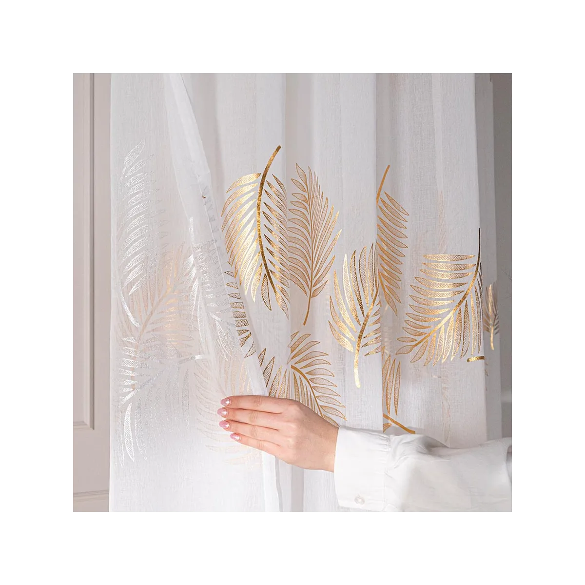 Pozwól, aby Twoje okno stało się prawdziwą ozdobą wnętrza! Firanka MARIETTA to niesamowita dekoracja, która zachwyca subtelną bielą oraz wyrafinowanym złotym wzorem liści. Ta lekka, półtransparentna tkanina przepuszcza mnóstwo światła, rozświetlając pomieszczenie i tworząc poczucie przestronności. Delikatne, ażurowe liście dodają elegancji i podkreślają nowoczesny lub klasyczny styl aranżacji. Gotowa do zawieszenia na taśmie marszczącej, firanka nie wymaga skomplikowanego montażu – wystarczy chwila, by odmienić swoje wnętrze! 🌿✨