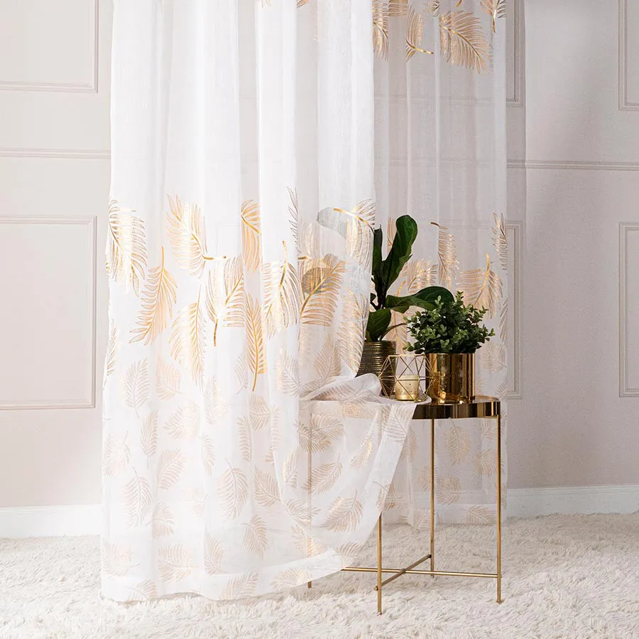 Firanka MARIETTA 140x250 cm – biała ze złotym motywem liści