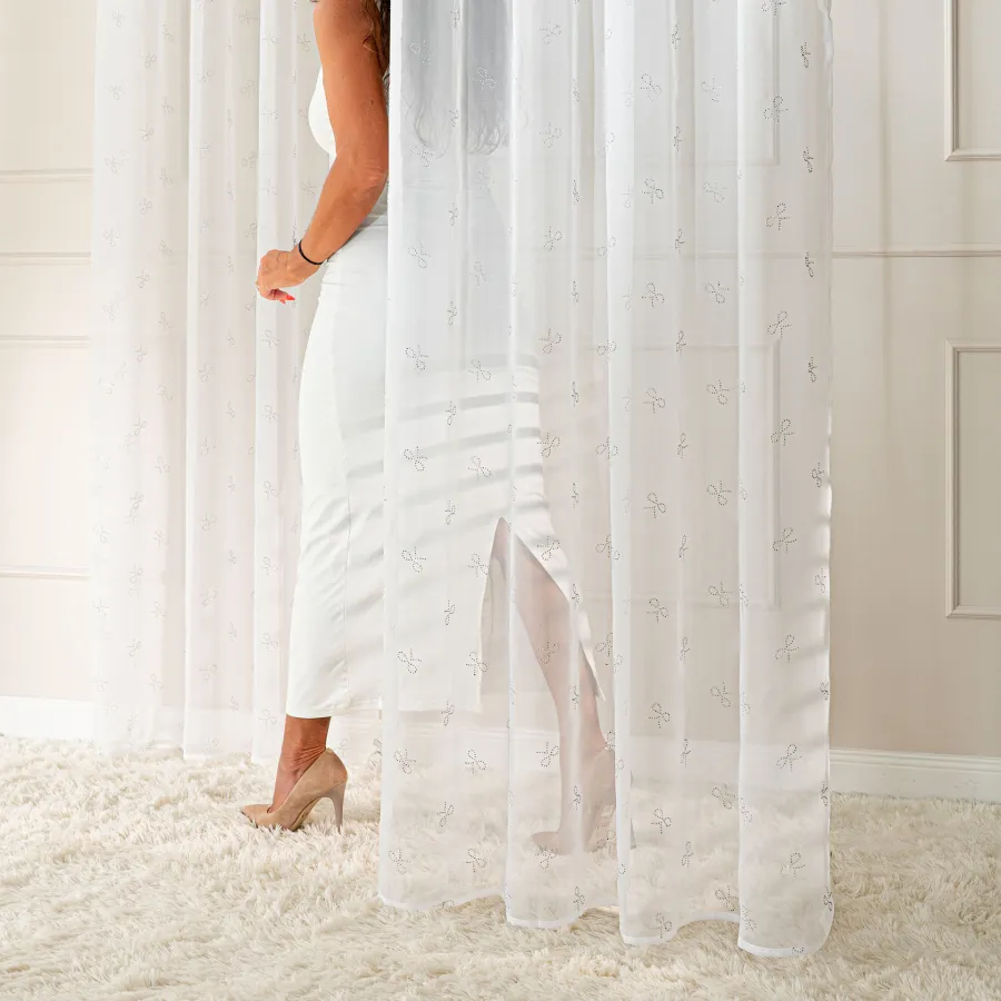 Odkryj wyjątkowy urok firanki RIBBON! To gotowa dekoracja okienna wykonana z transparentnej, delikatnej tkaniny o białym kolorze i finezyjnym srebrnym wzorze, który przypomina subtelne błyszczące refleksy. Srebrzyste elementy pięknie rozświetlają wnętrze, nadając mu nowoczesny i wyrafinowany charakter. Tkanina jest lekka, przewiewna i przyjemna w dotyku, a marszcząca taśma pozwala na szybkie uzyskanie efektownych fałd. Idealna na karnisz o długości od 90 do 120 cm – w sam raz na większość standardowych przestrzeni. Firanka RIBBON oczaruje każdego, kto lubi świeżość, styl i odrobinę eleganckiego błysku w swoim domu. ✨🪟