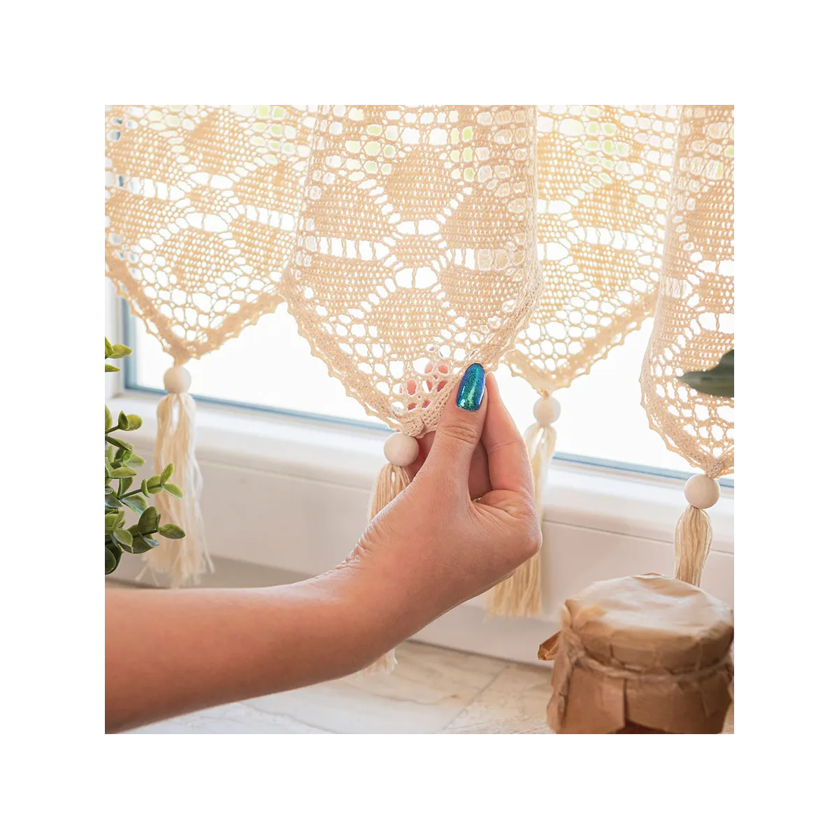 - 🧵 Ażurowy wzór – ręcznie wyglądające detale dodają firance lekkości i oryginalności.