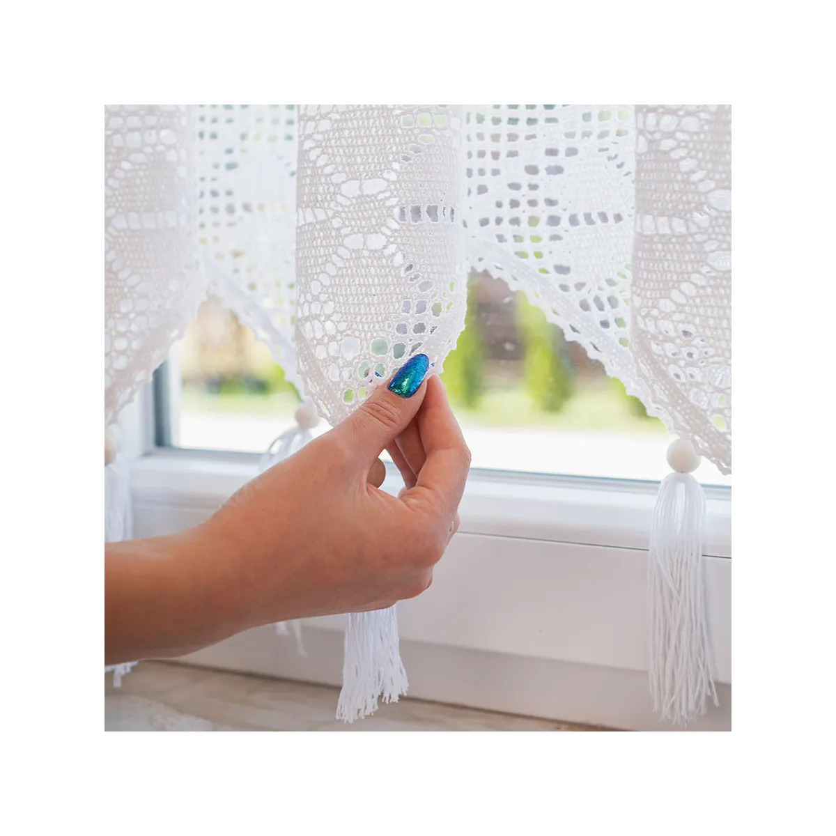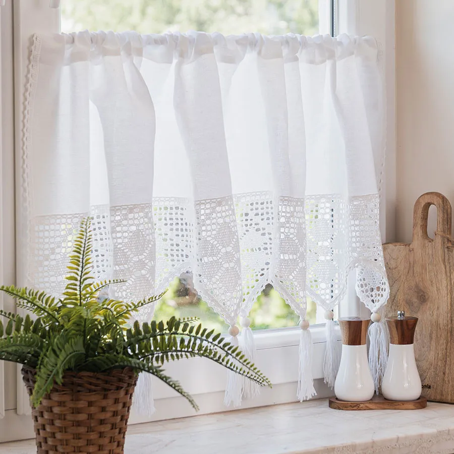 RACHELA – zazdrostka gotowa z ażurem 100x90 cm, kolor biały. Elegancka, ażurowa dekoracja okna, która rozjaśni wnętrze i doda mu lekkości w stylu boho lub vintage. Idealna do kuchni, jadalni i salonu. Szybki montaż, łatwa pielęgnacja, ponadczasowy wzór.