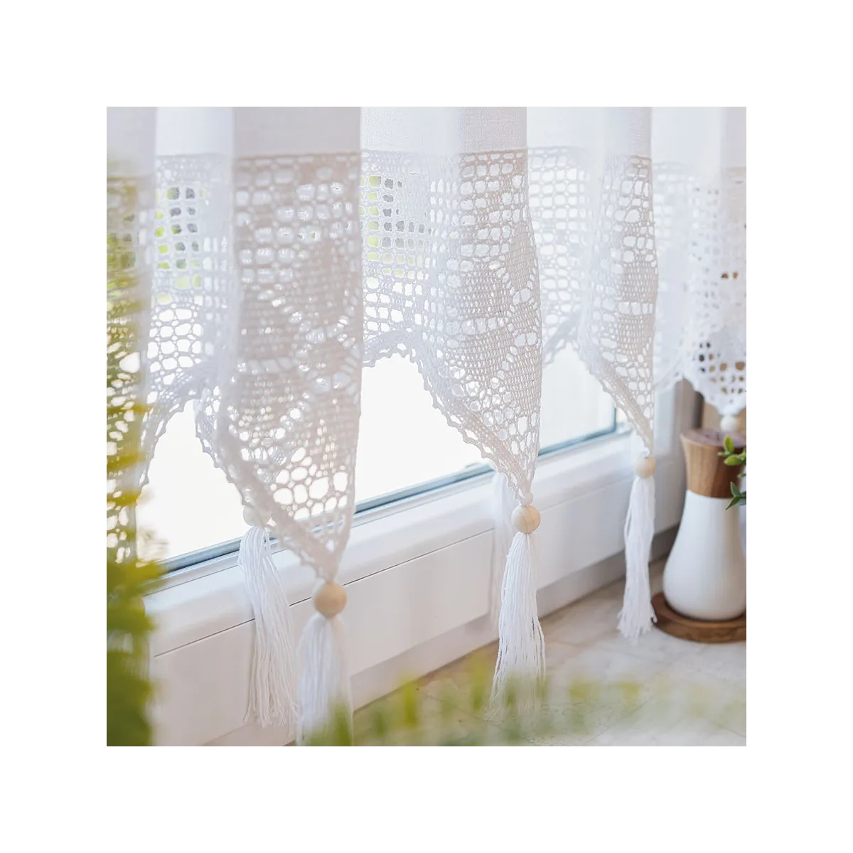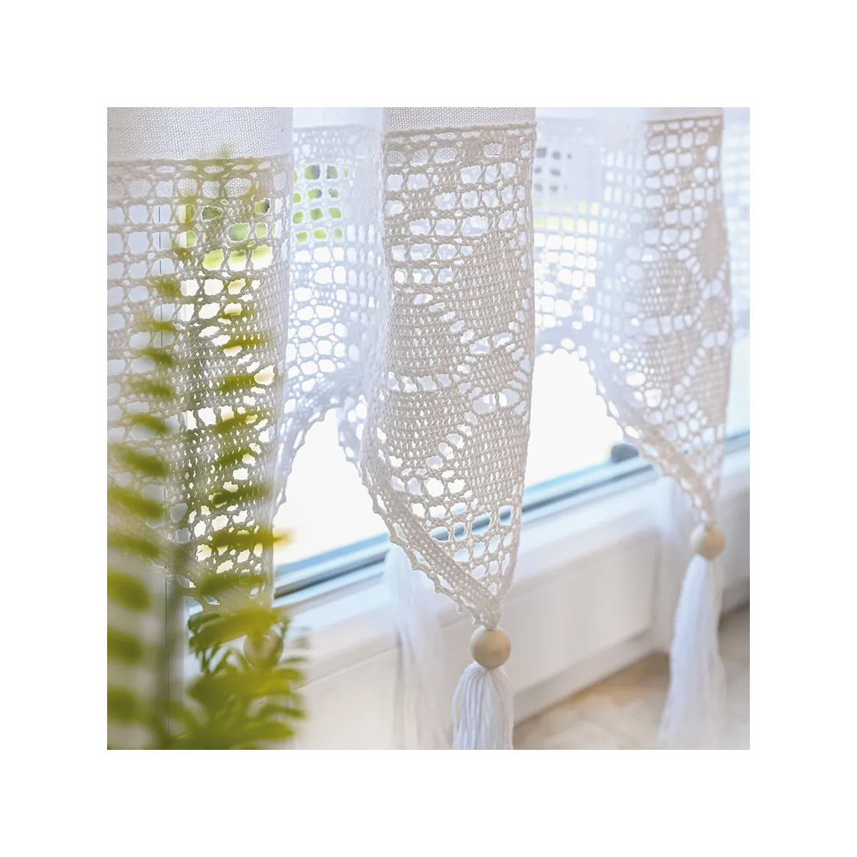 RACHELA – zazdrostka gotowa z ażurem 200x75 cm, kolor biały. Elegancka dekoracja okna z misternym wzorem i frędzlami, która rozjaśni wnętrze, doda mu lekkości i świeżości w stylu boho lub vintage. Idealna do kuchni, jadalni i salonu. Szybki montaż, łatwa pielęgnacja, ponadczasowy wzór.