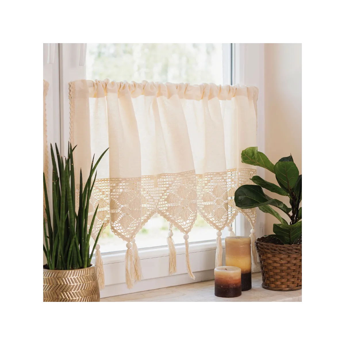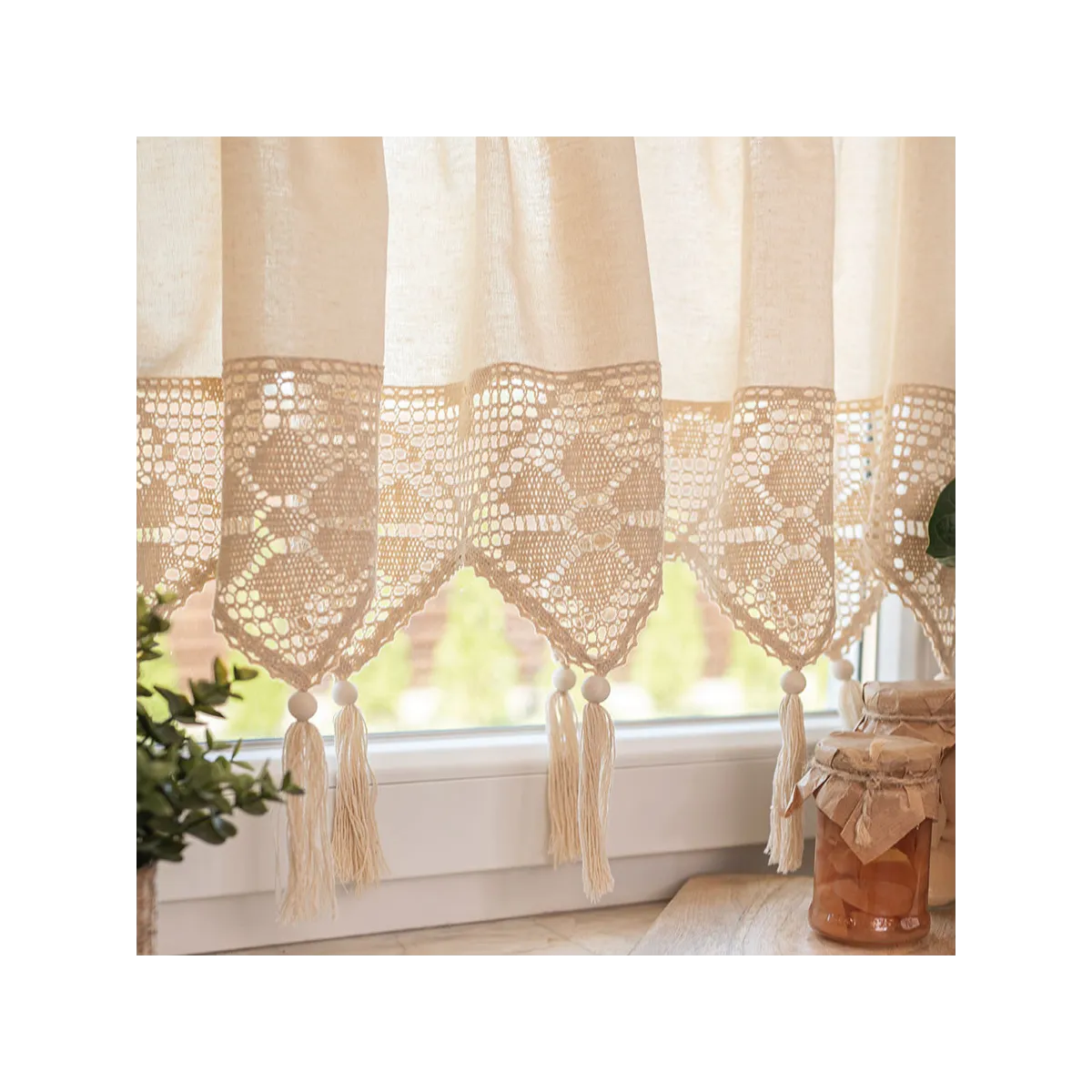 RACHELA – zazdrostka gotowa z ażurem 200x75 cm, kolor kremowy. Stylowa dekoracja okna z ażurowym wykończeniem, która rozświetli wnętrze i doda mu przytulności w stylu boho lub vintage. Idealna do kuchni, jadalni i salonu. Szybki montaż, łatwa pielęgnacja, wyjątkowy wzór.