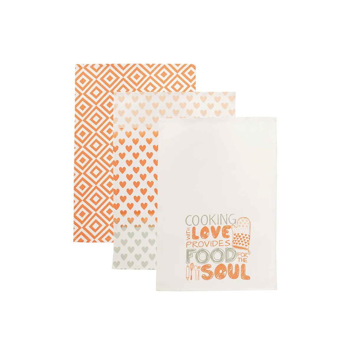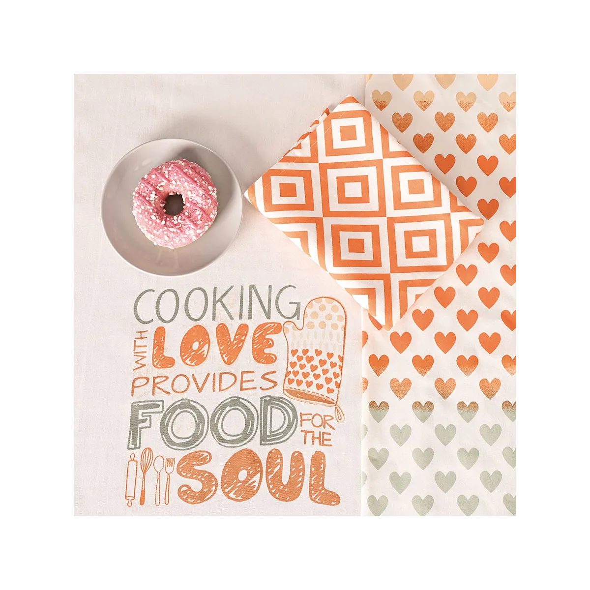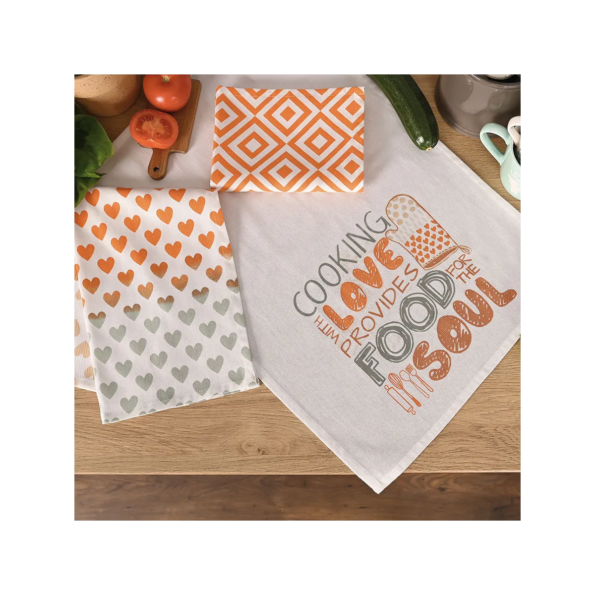 Komplet 3 ścierek kuchennych LOVE FOR SOUL 40x60 cm – 100% bawełna, modne wzory w odcieniach pomarańczu i szarości. Doskonała chłonność i trwałość. Idealne do każdej kuchni, łatwe w pielęgnacji – dekoracyjne i praktyczne akcesorium do Twojego domu!