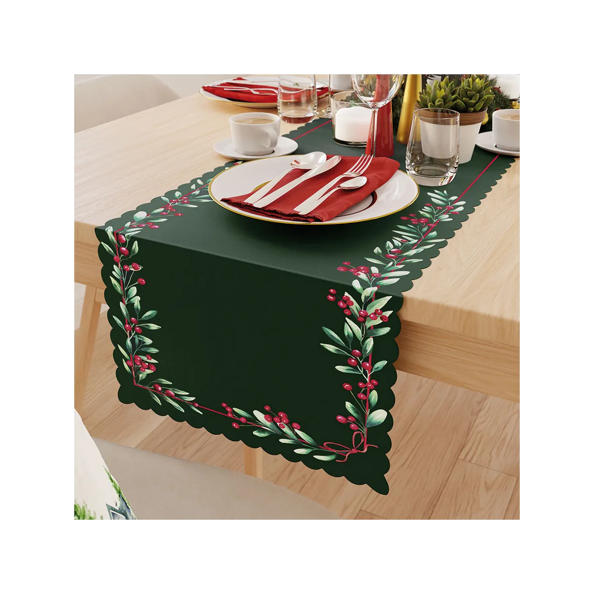 Wprowadź do wnętrza wyrazisty, bożonarodzeniowy akcent – wybierz bieżnik JARZĘBINA i przygotuj stół na wyjątkowe spotkania.