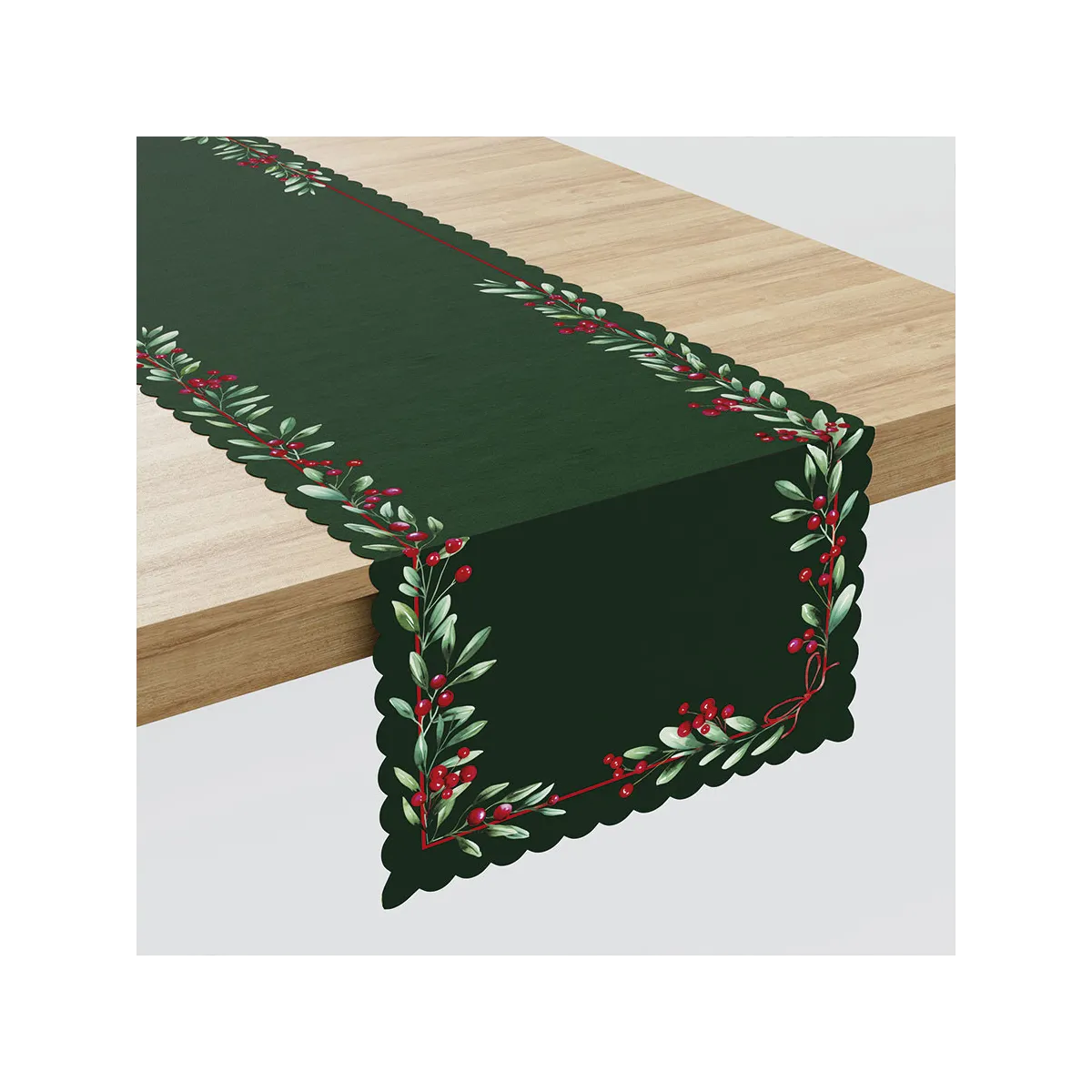 W kategorii Boże Narodzenie liczą się detale, które budują nastrój przy stole. Bieżnik JARZĘBINA w kolorze zielonym przyciąga wzrok haftowanym, świątecznym motywem gałązek z czerwonymi owocami i dekoracyjną linią przy krawędzi.