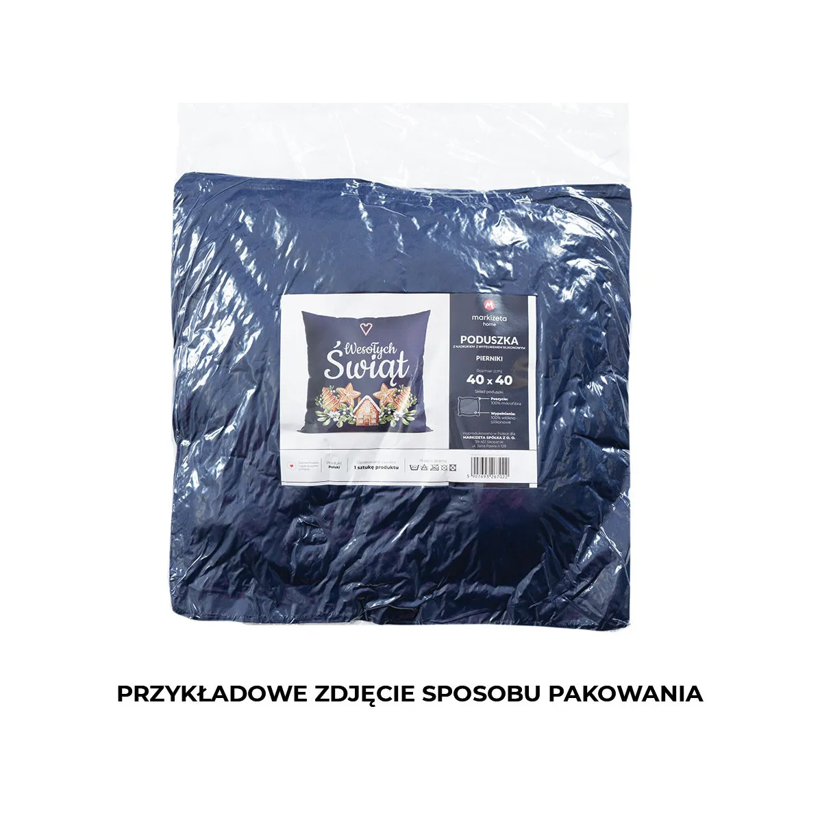 Stwórz ciepły klimat w domu z poduszką PIERNIKI od Markizeta. Granatowa kolorystyka (002) pięknie podkreśla haftowany motyw pierników i napis „Wesołych Świąt”, dzięki czemu dekoracja natychmiast przyciąga wzrok. Poszycie z miękkiej mikrofibry wykonanej w 100% z poliestru jest przyjemne w dotyku i odporne na codzienne użytkowanie, a sprężyste wypełnienie silikonowe pomaga zachować kształt. Klasyczny wymiar 40x40 cm z tolerancją +/- 3% sprawia, że to uniwersalny dodatek do sofy, fotela lub łóżka. Model jest dwustronny, więc jednym ruchem odmienisz aranżację i dopasujesz ją do świątecznego wystroju.