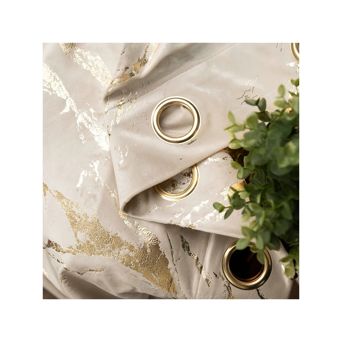 Zasłona MARMA na przelotkach 140x250 cm jasny kremowy ze złotym nadrukiem – elegancki welwet z połyskiem, który doda wnętrzu klasy, zapewni dekoracyjność i wygodę użytkowania. Idealna na karnisz 70–95 cm, do salonu, sypialni i gabinetu. Szybki montaż i łatwa pielęgnacja.