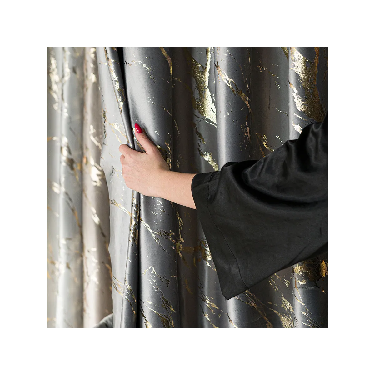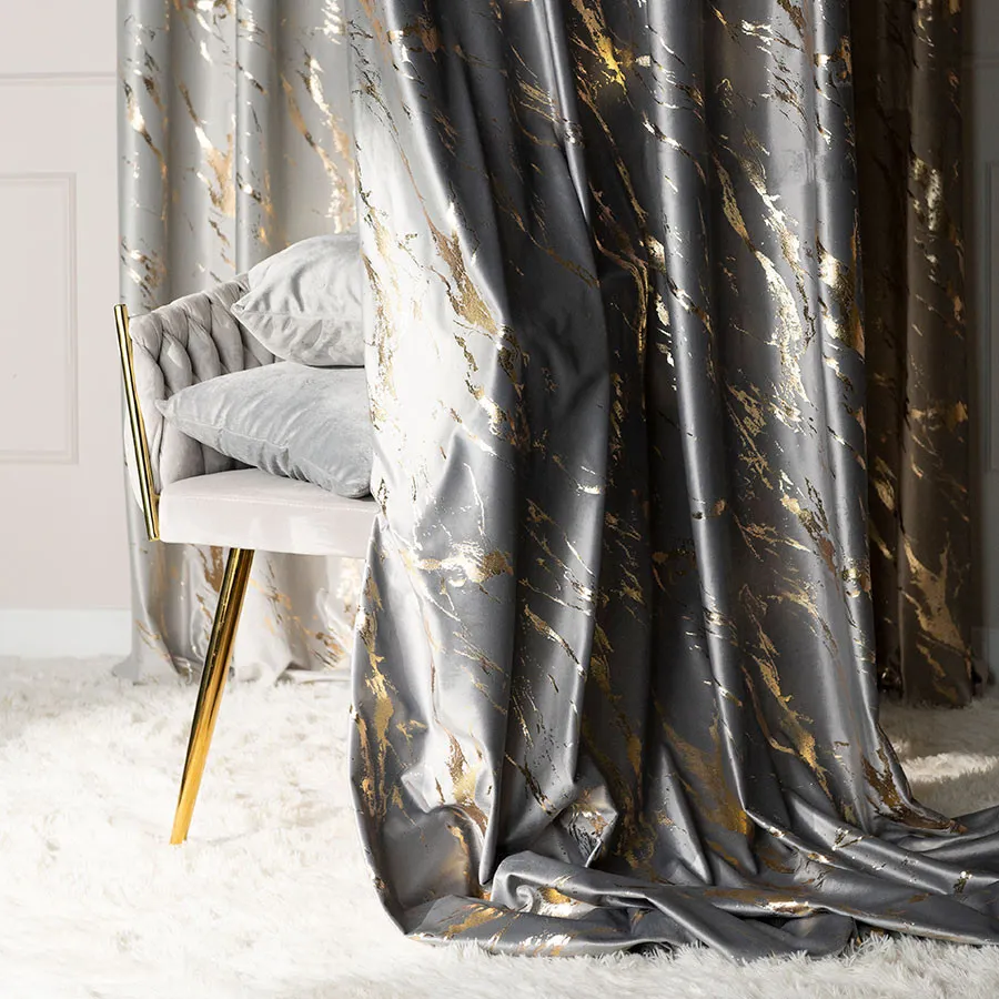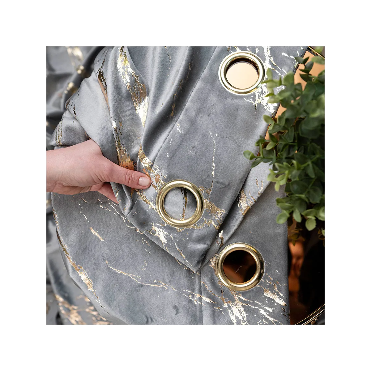 MARMA to połączenie modnej elegancji i wygody, które wprowadzi do Twojego wnętrza odrobinę luksusu! Wykonana z miękkiego welwetu, ta zasłona w jasnoszarym kolorze zachwyca złotym, przecieranym nadrukiem przypominającym szlachetny marmur. Materiał pięknie odbija światło i delikatnie połyskuje w promieniach słońca, dodając aranżacji stylowego blasku. Zasłona jest przyjemna w dotyku, lekko zaciemnia pomieszczenie i doskonale układa się na przelotkach – dzięki nim zmienisz wygląd Twojego karnisza w kilka chwil. ✨🪶