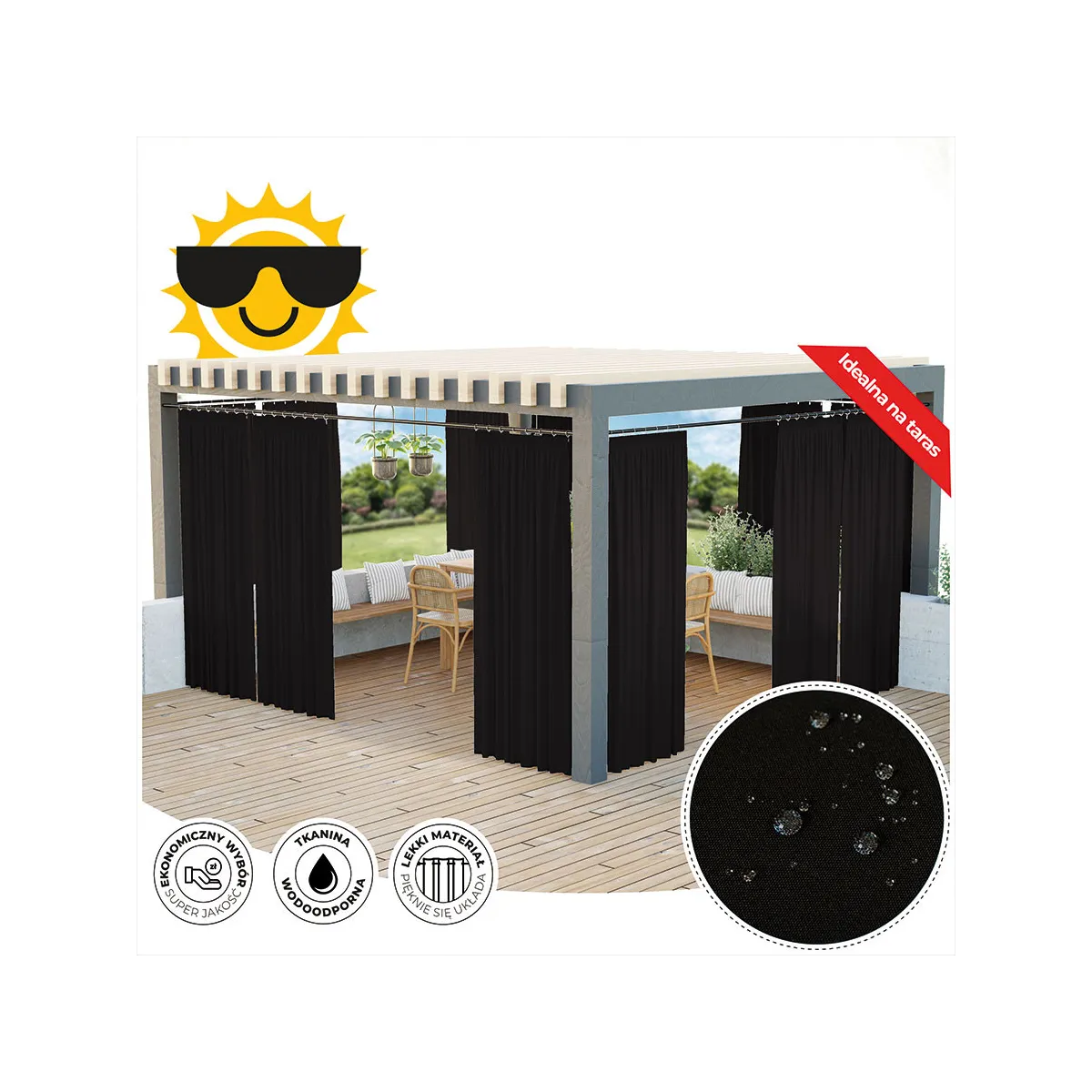 Zasłona ogrodowa Gardenia wodoodporne wykończenie chroni przed deszczem oraz wilgoci, dzięki czemu będzie bardziej odporna na czynniki zewnętrzne.Przeznaczona jest do użytkowania na tarasie, pergoli, balkonie czy altanie. Zasłona wykończona taśmą wielofunkcyjną z możliwością zawieszenia na żabki, agrafki oraz tunel. Kolekcja zasłon Gardenia składa się z siedmiu kolorów dostępnych w różnych rozmiarach.