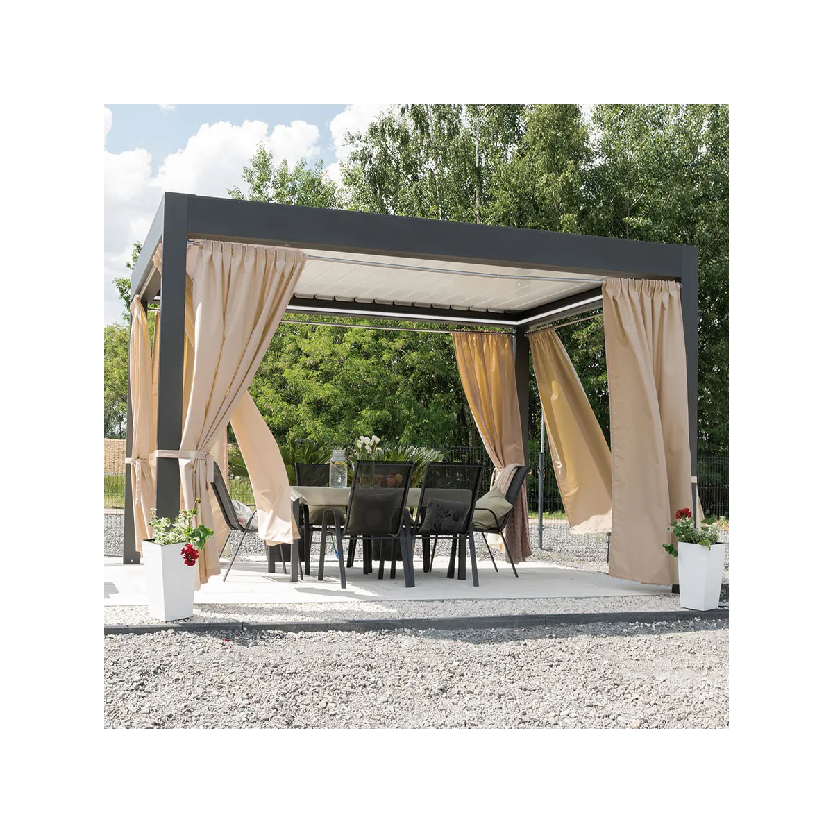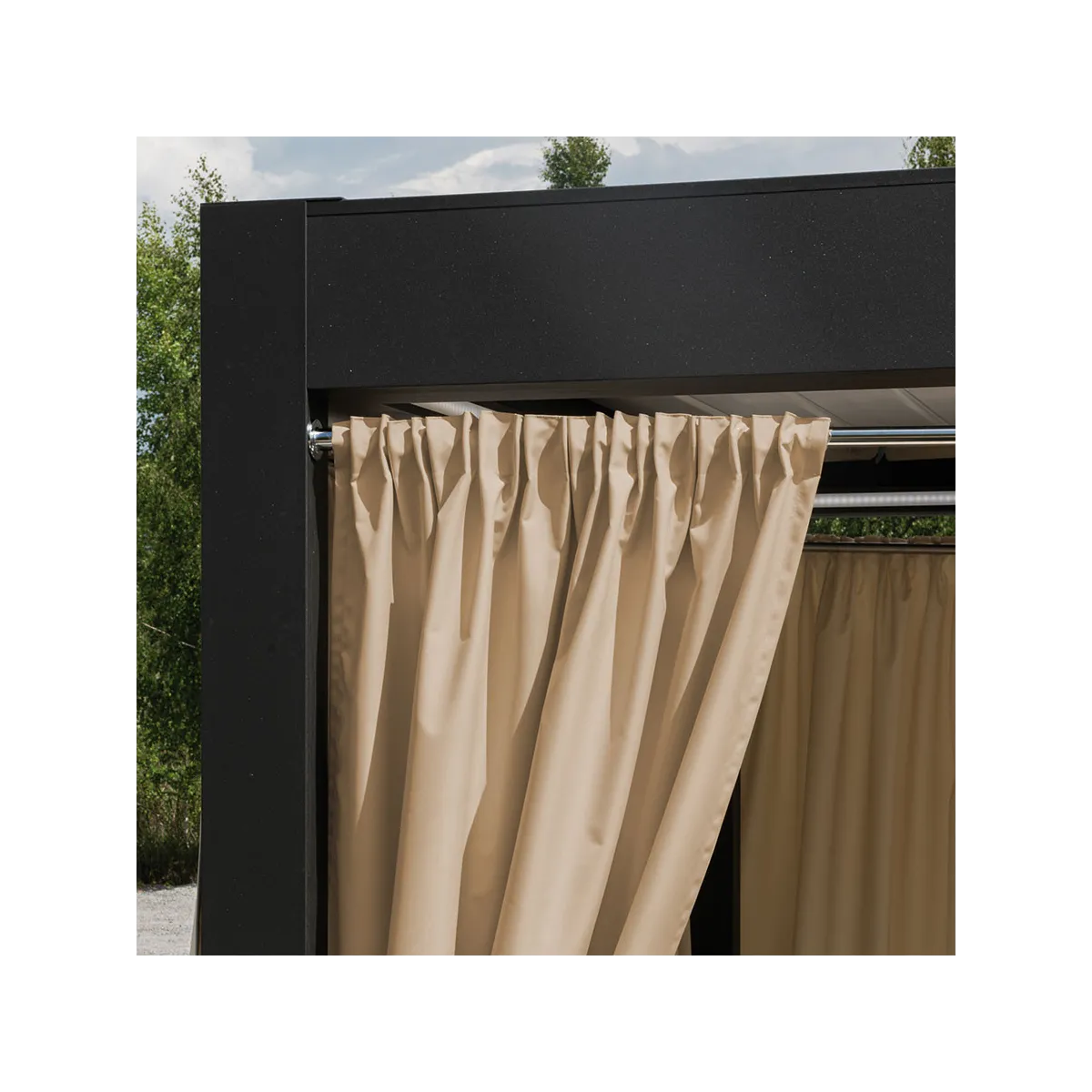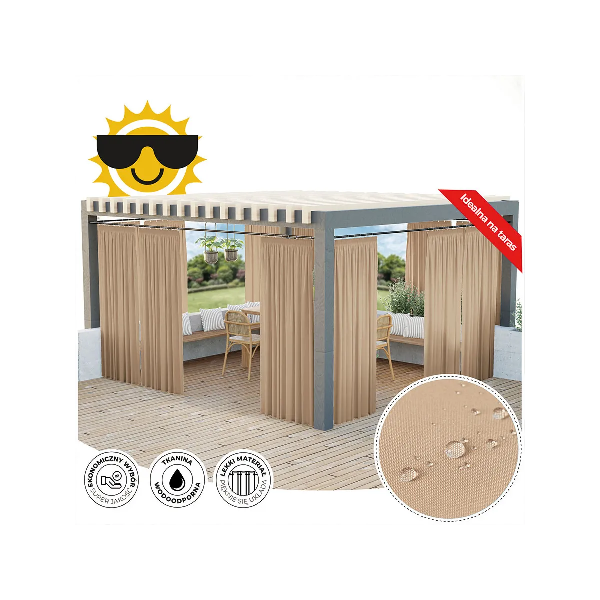 Zasłona ogrodowa Gardenia wodoodporne wykończenie chroni przed deszczem oraz wilgoci, dzięki czemu będzie bardziej odporna na czynniki zewnętrzne.Przeznaczona jest do użytkowania na tarasie, pergoli, balkonie czy altanie. Zasłona wykończona taśmą wielofunkcyjną z możliwością zawieszenia na żabki, agrafki oraz tunel. Kolekcja zasłon Gardenia składa się z siedmiu kolorów dostępnych w różnych rozmiarach.